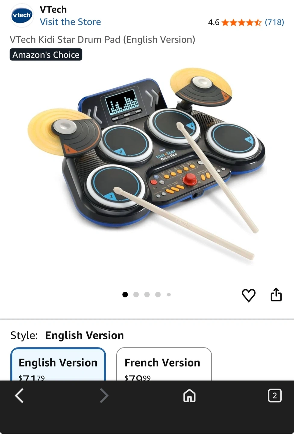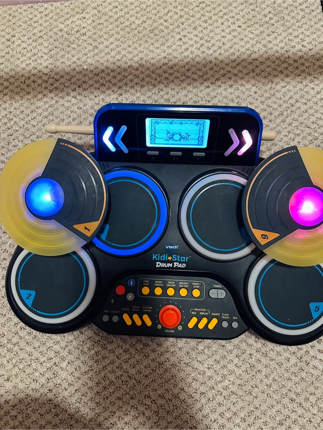 This VTech Kidi Star Drum Pad is a fun electronic drum set for kids. It has various modes like free play, music tracks, and drum styles. Includes drumsticks and lights up when played!
