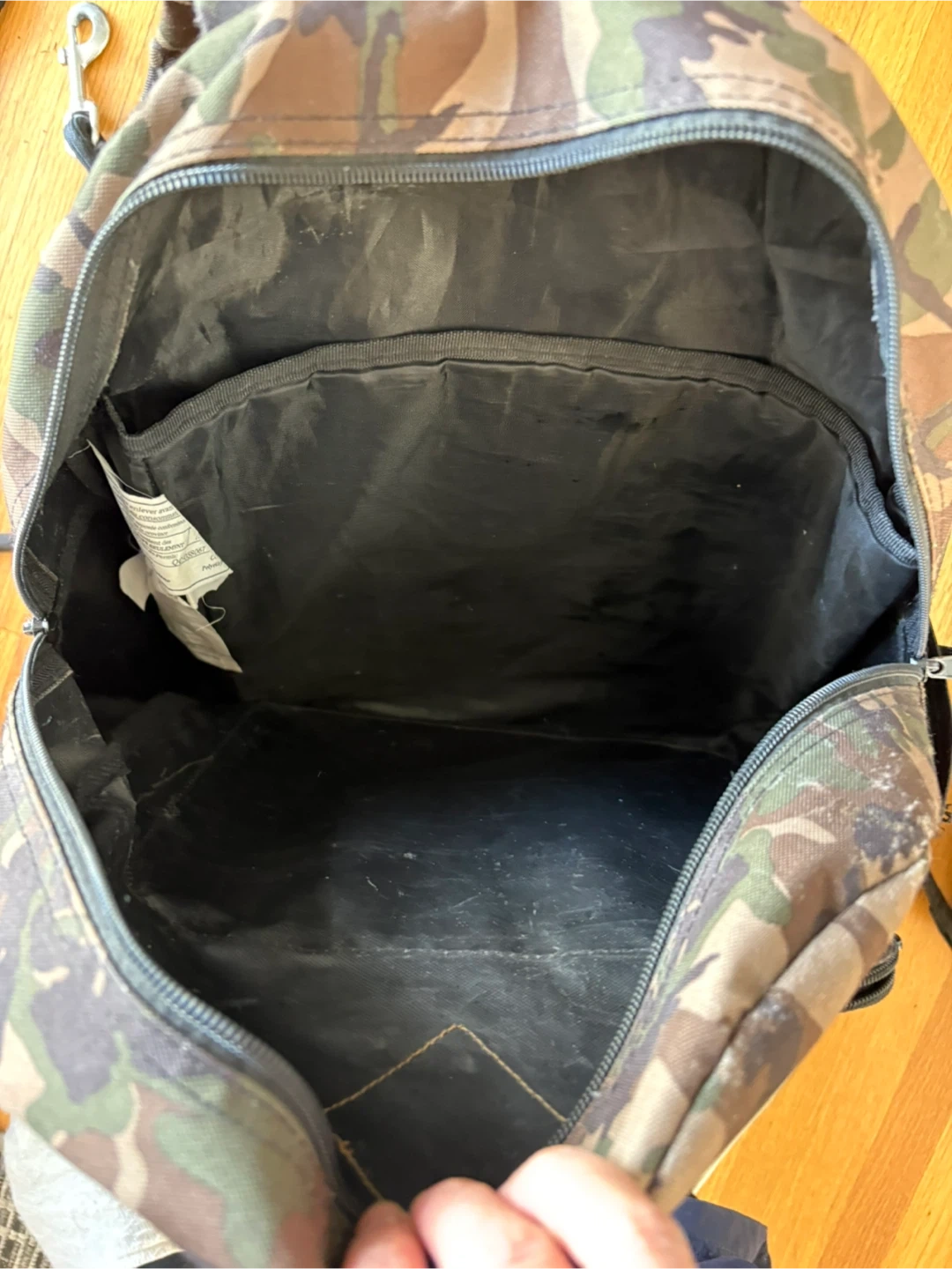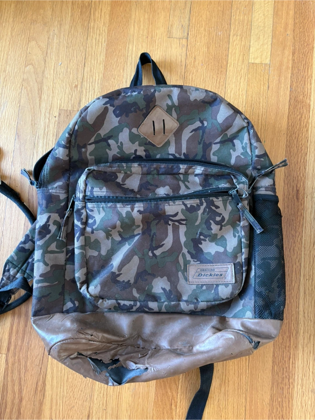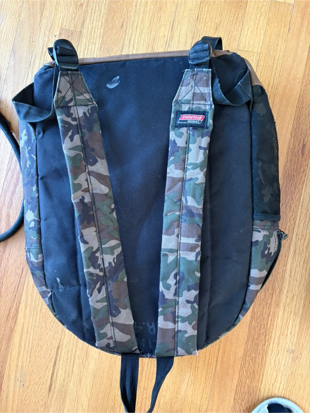 Dickies camouflage backpack with a front zippered pocket and side mesh pockets. It has adjustable padded shoulder straps. Some wear is visible on the bottom.