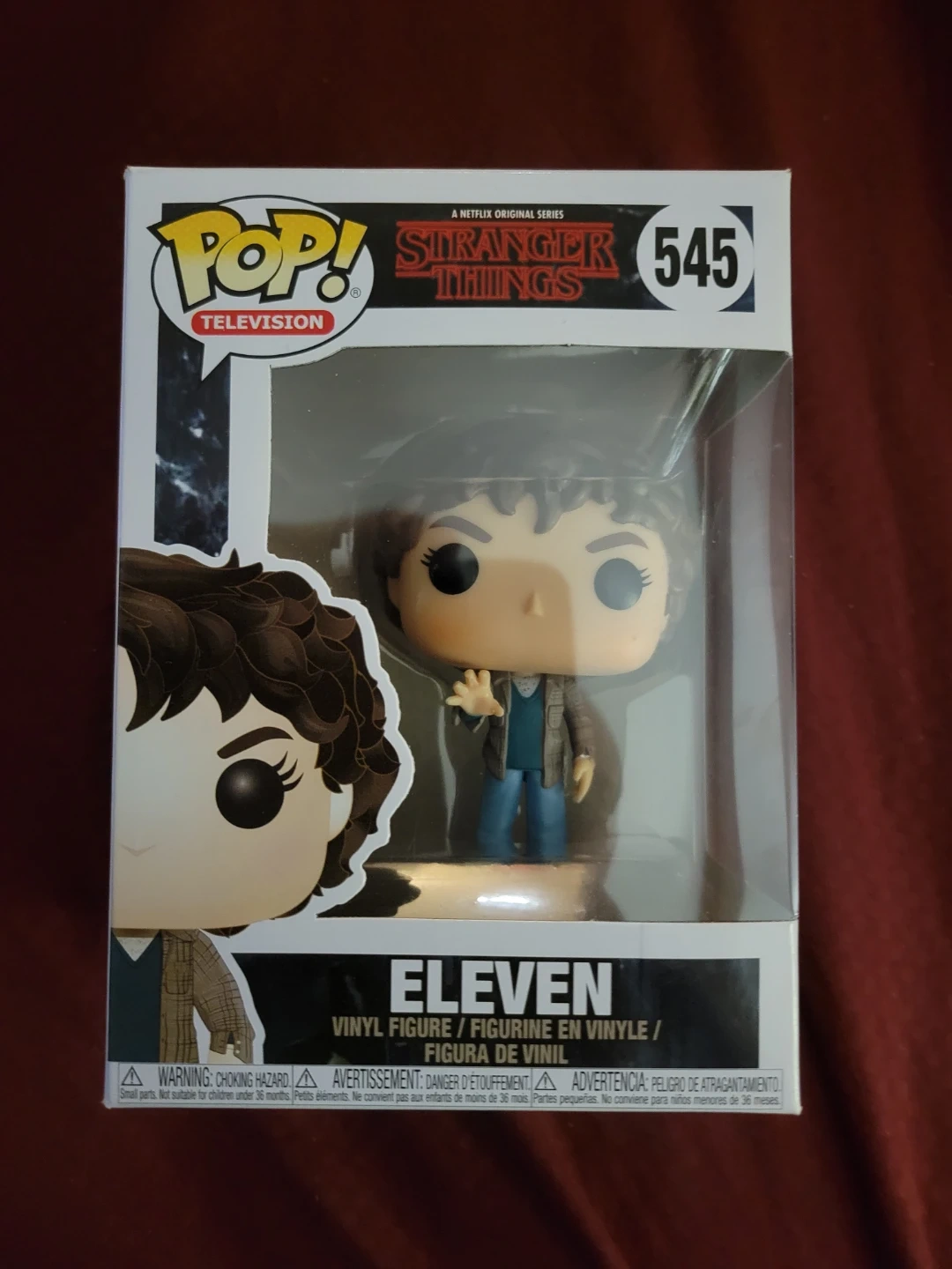 This is a Funko Pop! vinyl figure of Eleven from Stranger Things. It's model number 545 in the television series line. The figure comes in its original box. It's made of vinyl.