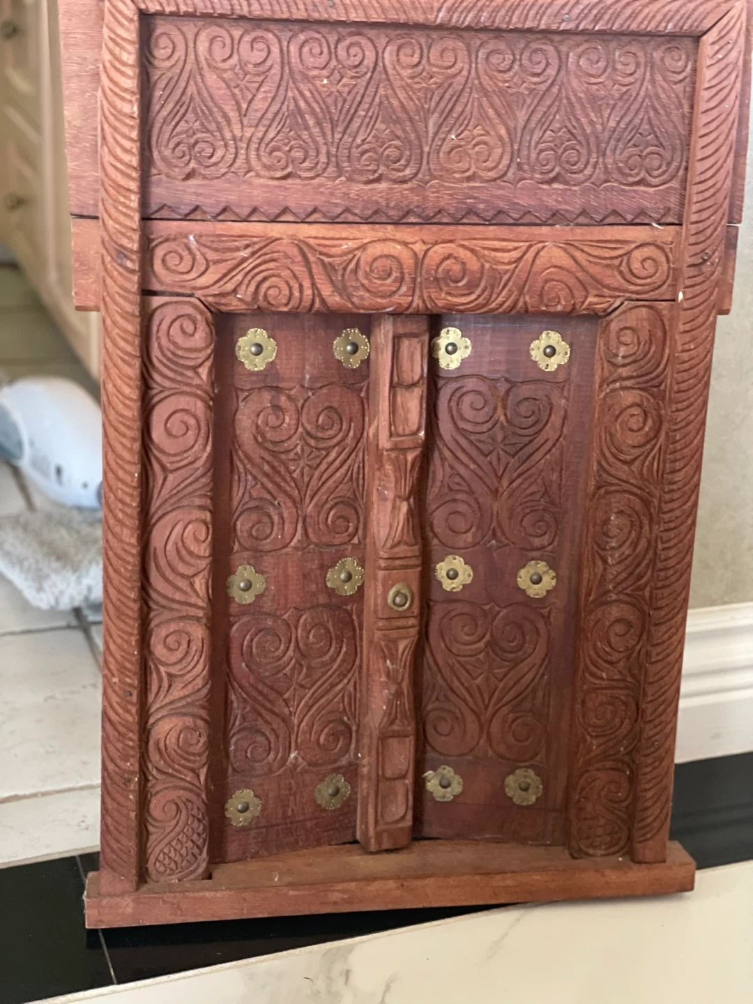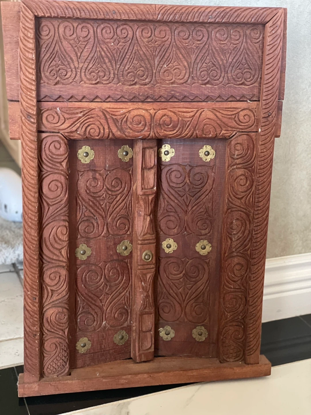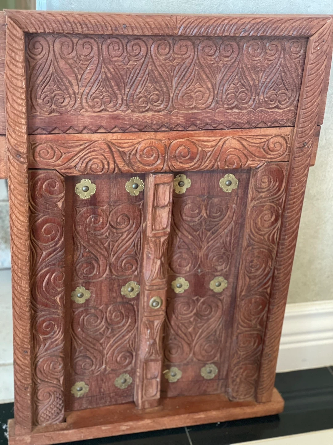Selling a unique, vintage carved wooden miniature door. It features intricate carvings and brass accents. A charming piece for decor or collectors