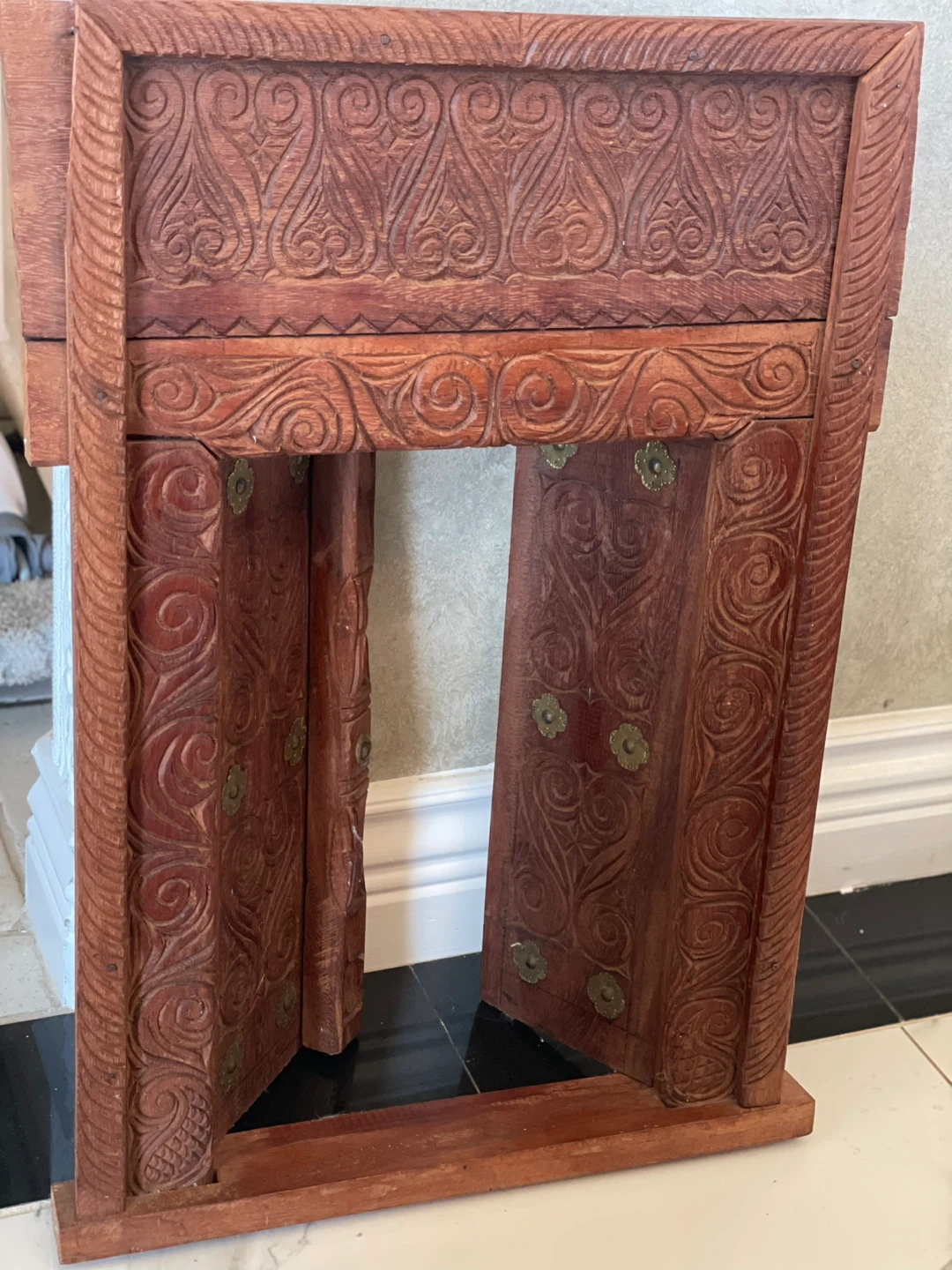 Selling a unique, vintage carved wooden miniature door. It features intricate carvings and brass accents. A charming piece for decor or collectors