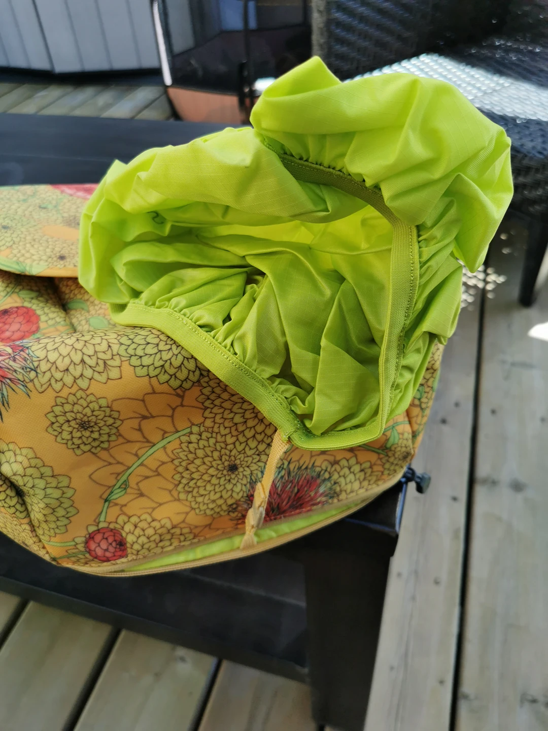 Rain cover in secret zipped compartment (never used)