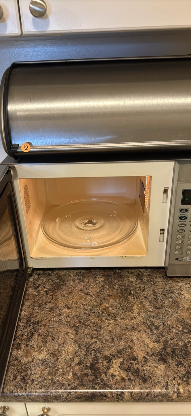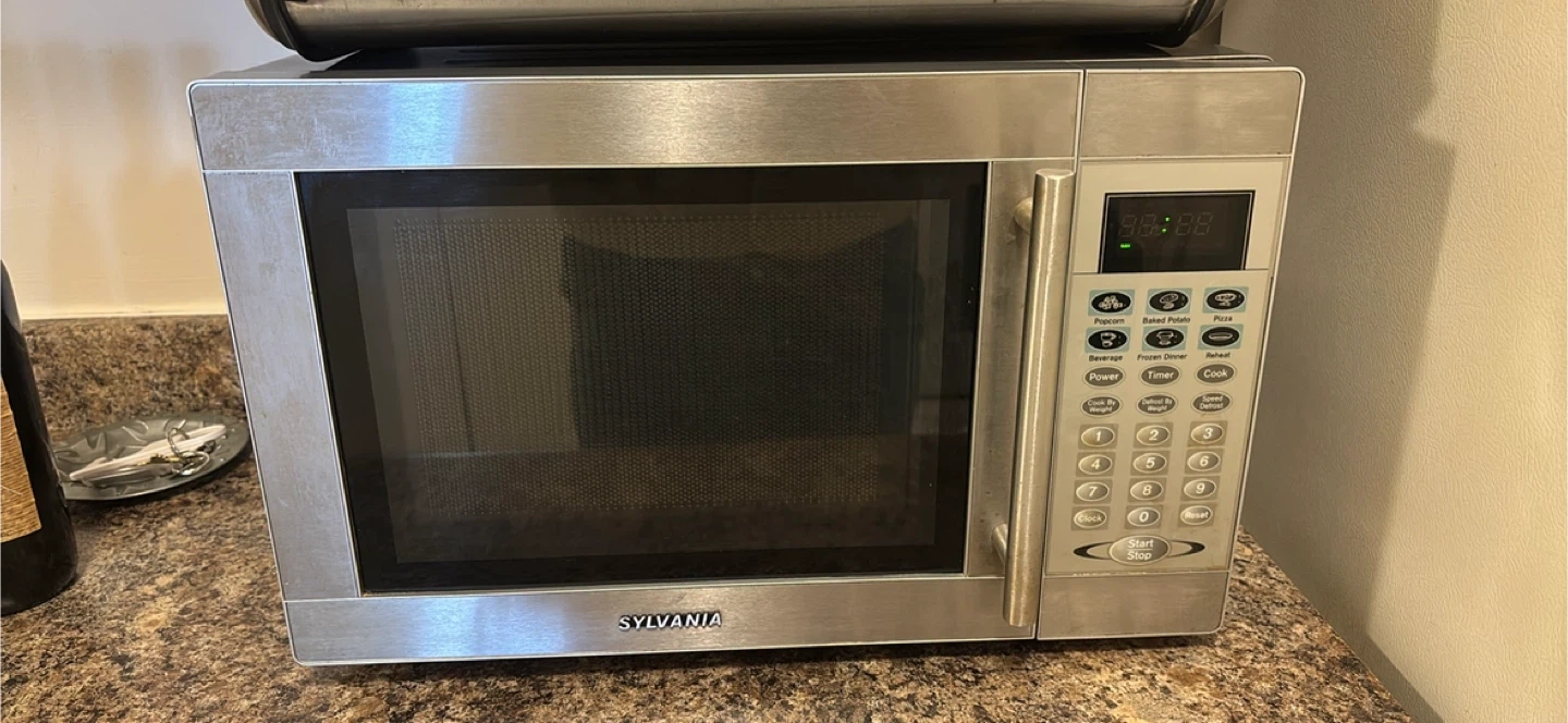 Stainless steel Sylvania microwave oven. Comes with a glass turntable. Perfect for quick meals and reheating food!