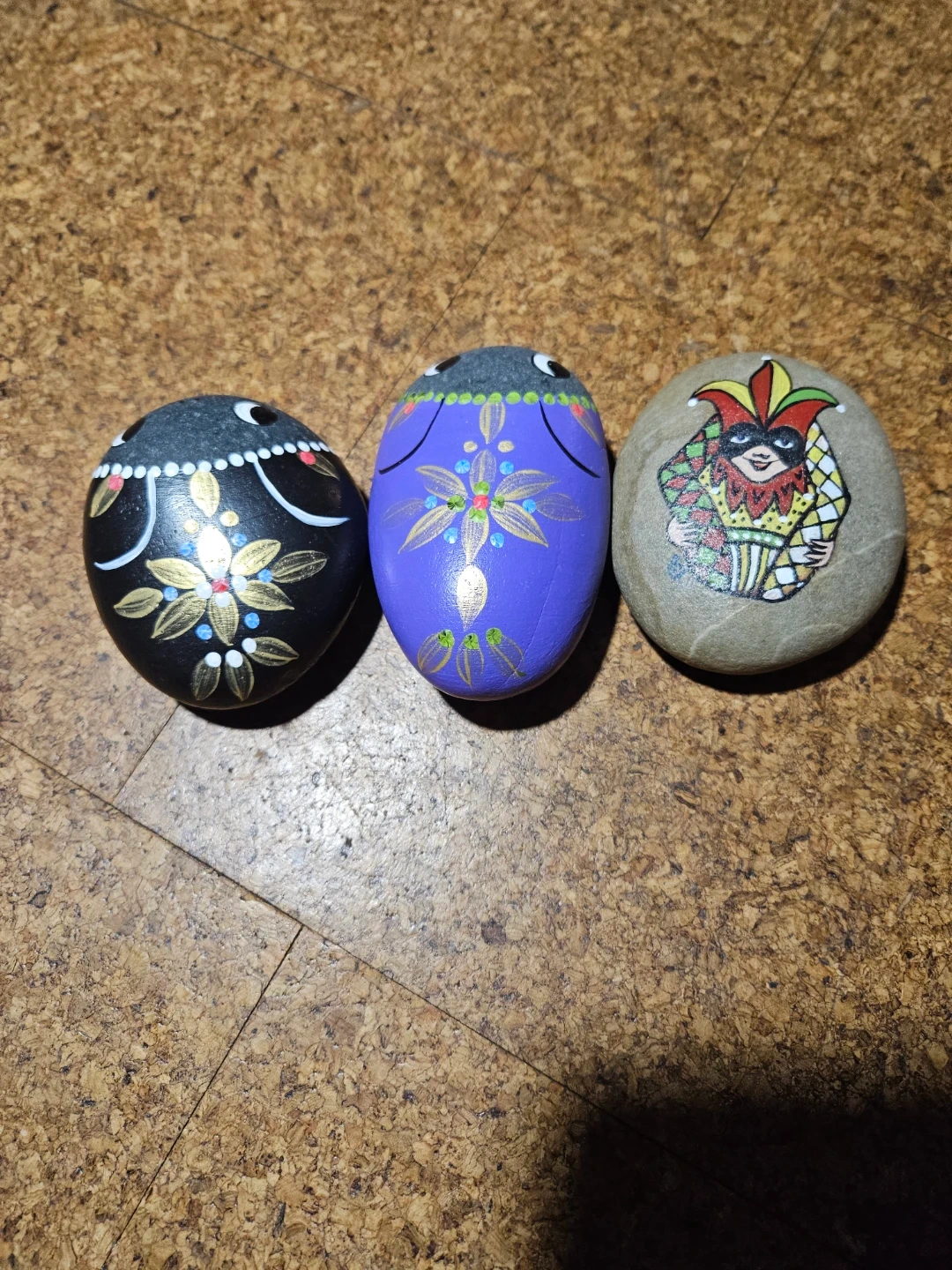 This is a set of three unique hand-painted decorative stones. They feature distinct artistic designs, including floral patterns and a jester motif. Each stone is a unique piece of art, perfect for adding a touch of charm to your home decor.
