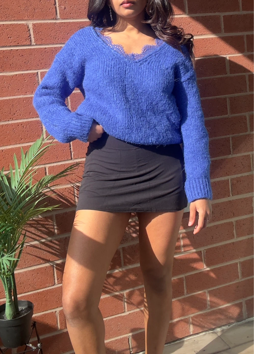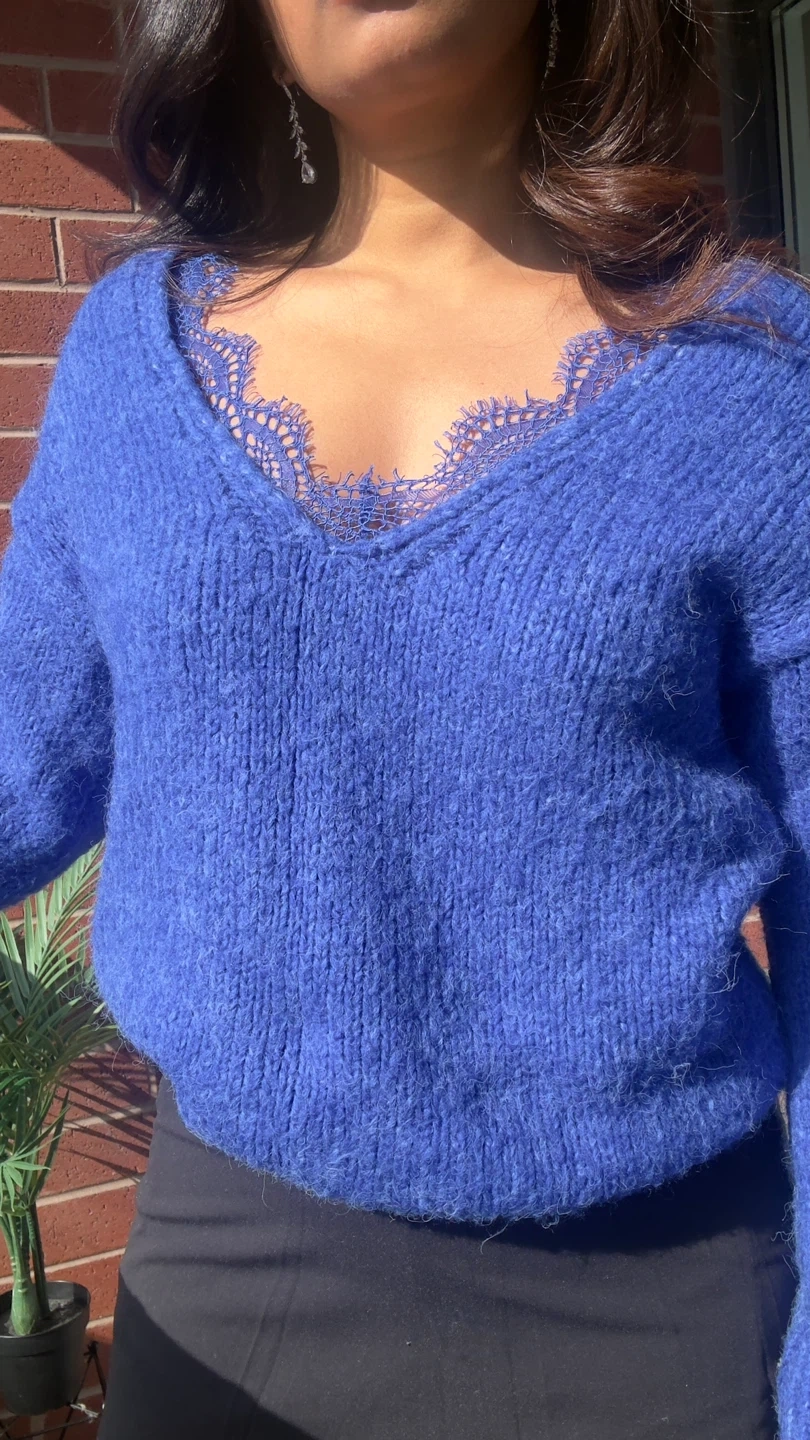 This Zara sweater is a lovely shade of blue. It features a V-neckline with delicate lace trim. It's a comfortable knit perfect for layering or wearing on its own.