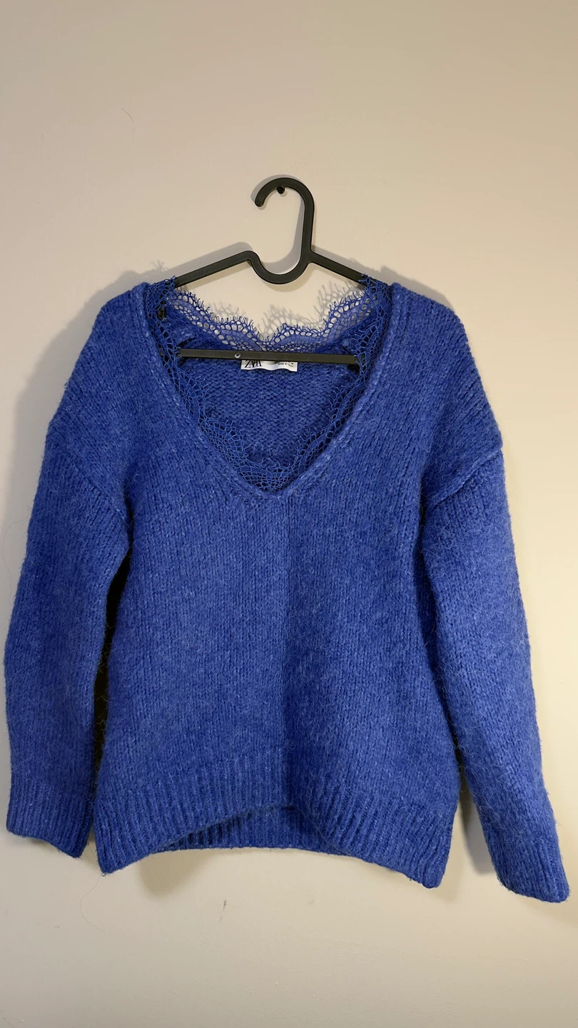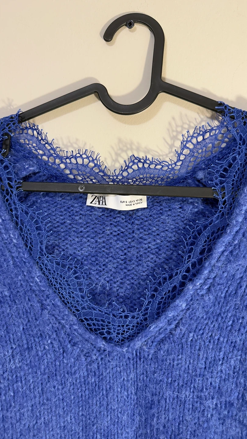 This Zara sweater is a lovely shade of blue. It features a V-neckline with delicate lace trim. It's a comfortable knit perfect for layering or wearing on its own.
