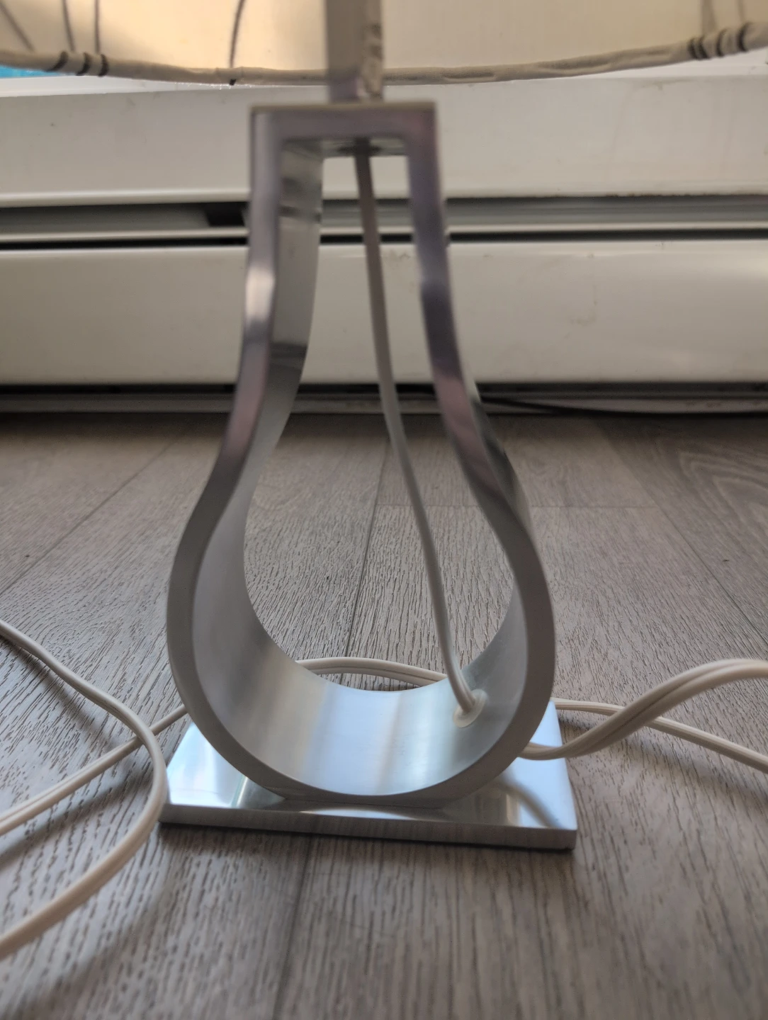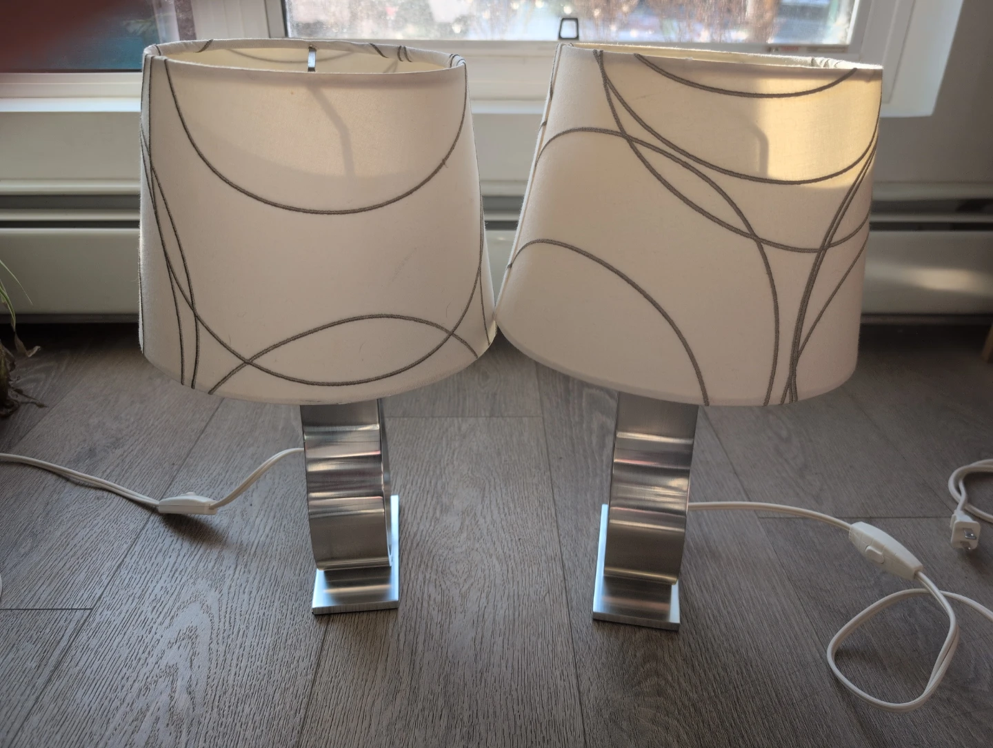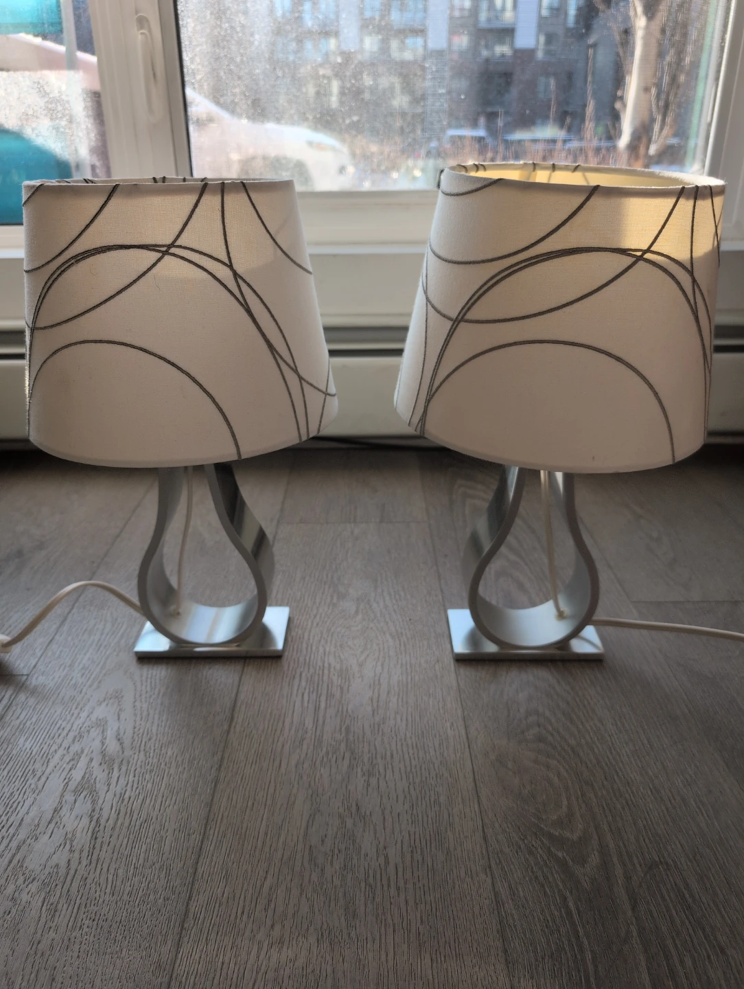 Selling a pair of matching table lamps. Each lamp has a white fabric shade with a black swirly line design. The base is made of silver-toned metal with a sleek, curved design. Perfect for a bedside table or living room. Includes the lightbulbs shown. Both work great