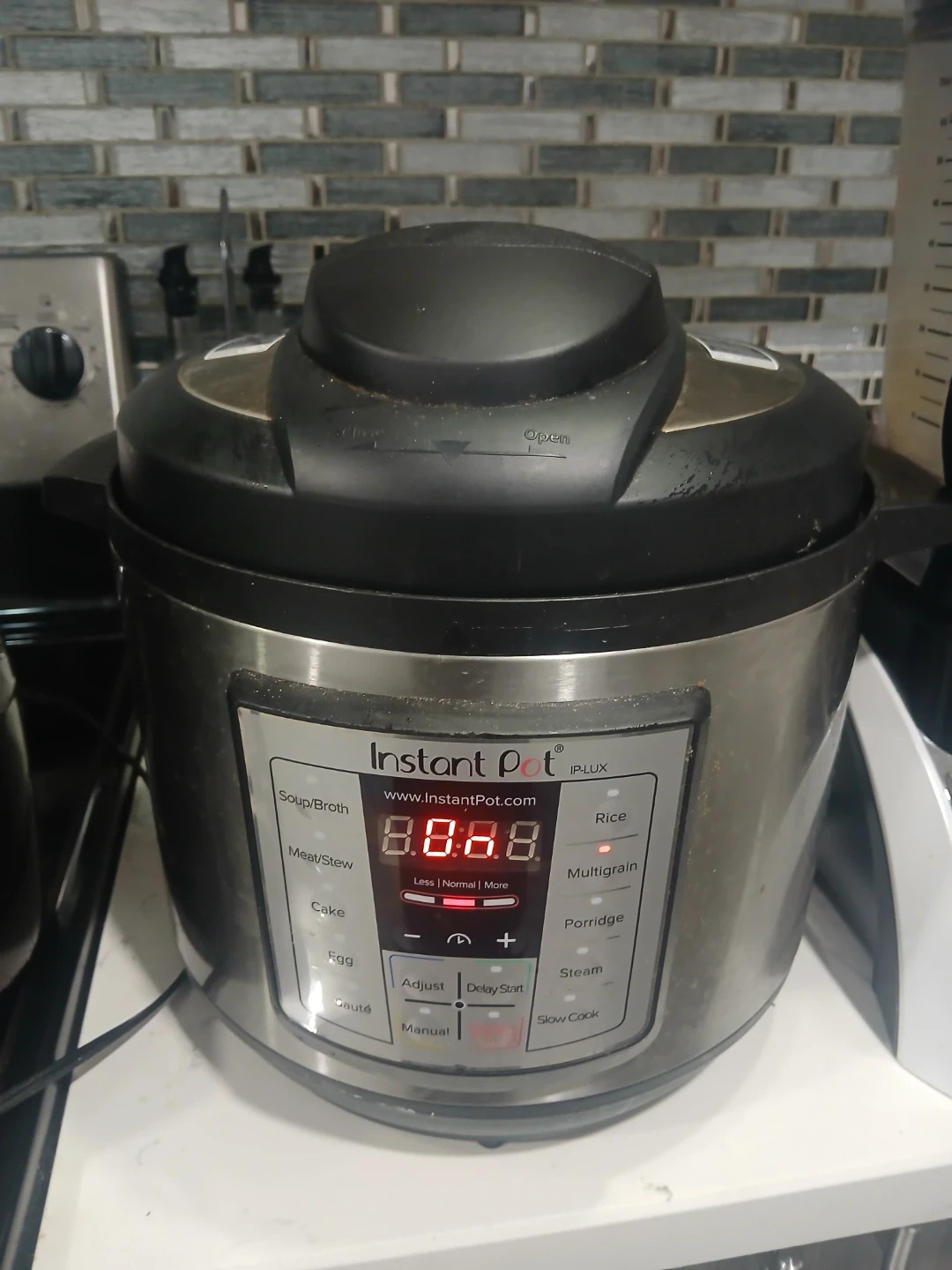 This Instant Pot IP-LUX is a versatile multi-cooker. It's designed for pressure cooking, steaming, slow cooking, and more. The control panel shows presets for soup, meat, cake, egg, sauté, rice, multigrain, porridge, steam, and slow cook.