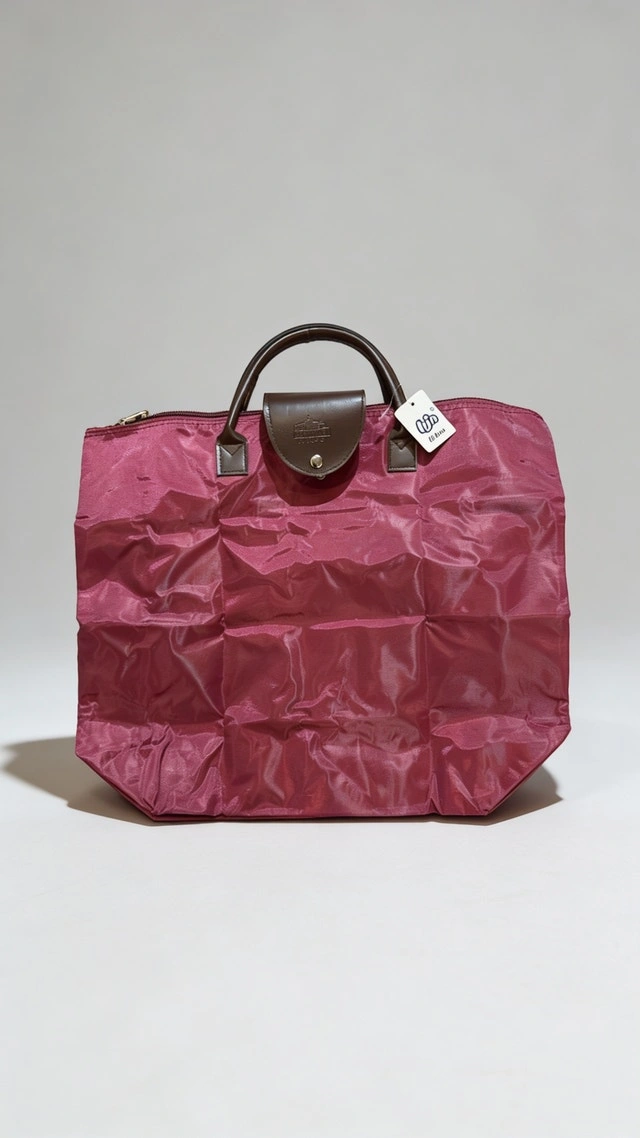Brand new, never used foldable tote bag in a dusty-rose/pink tone. It has leather-style handles, a full zip-top closure, and a clean, minimal look—great for everyday carry or travel.