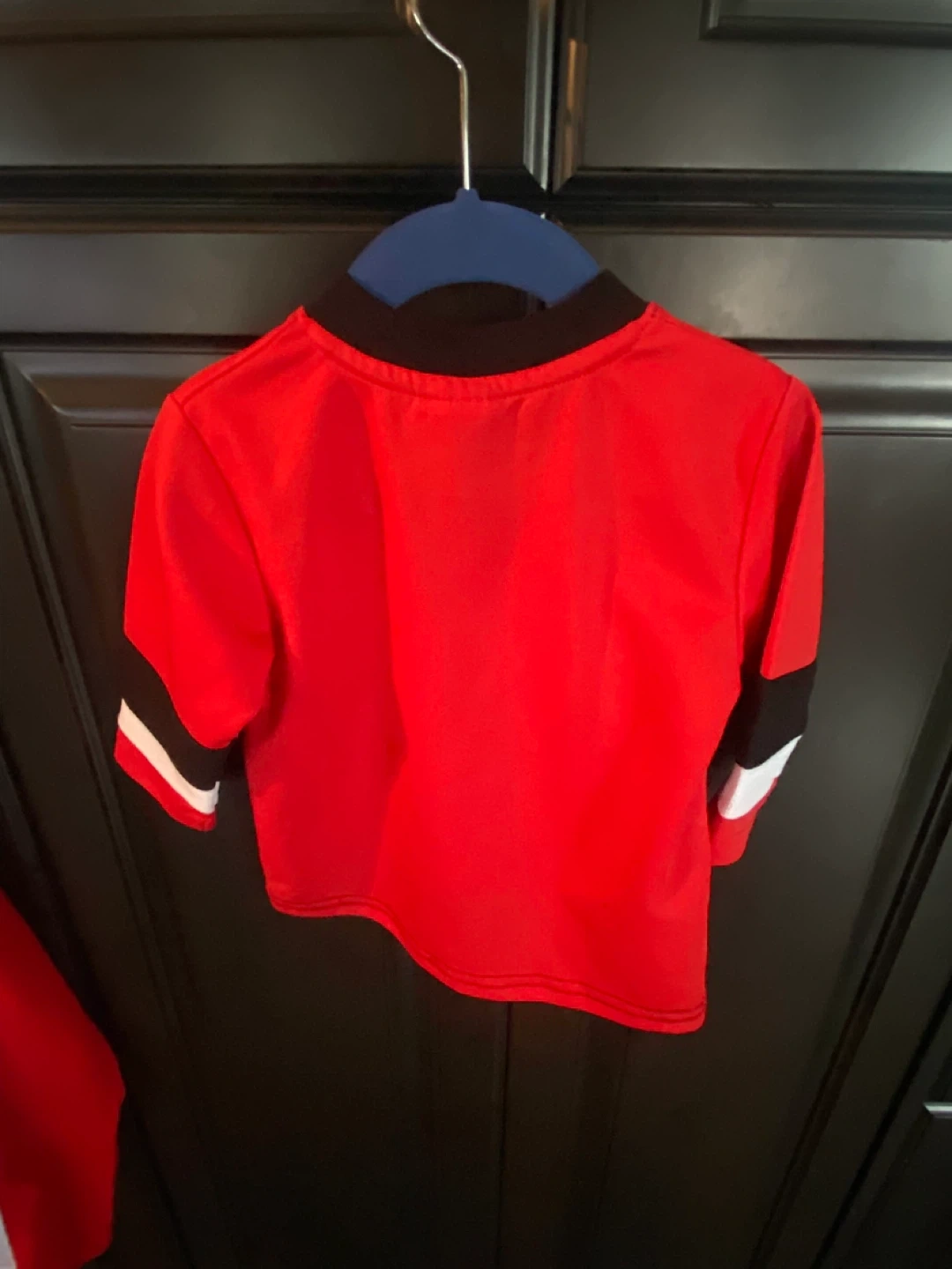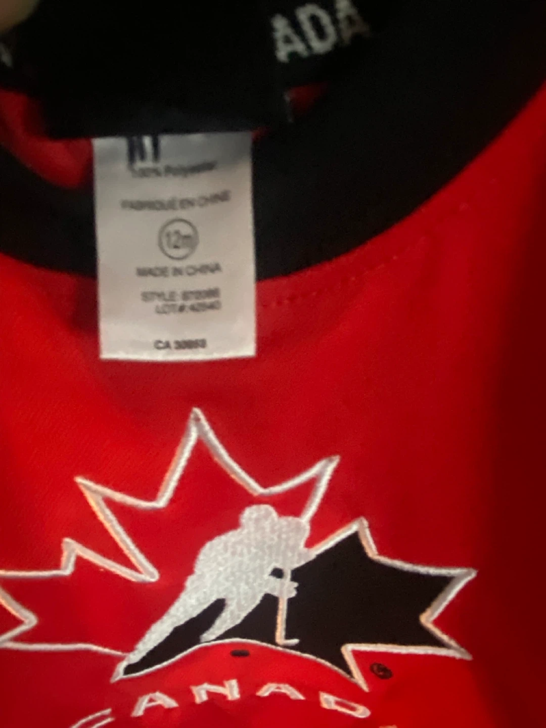 This is a kids' hockey jersey. It's red with black and white accents and features a Canada maple leaf logo with a hockey player. Made from 100% polyester. Size 12 months.