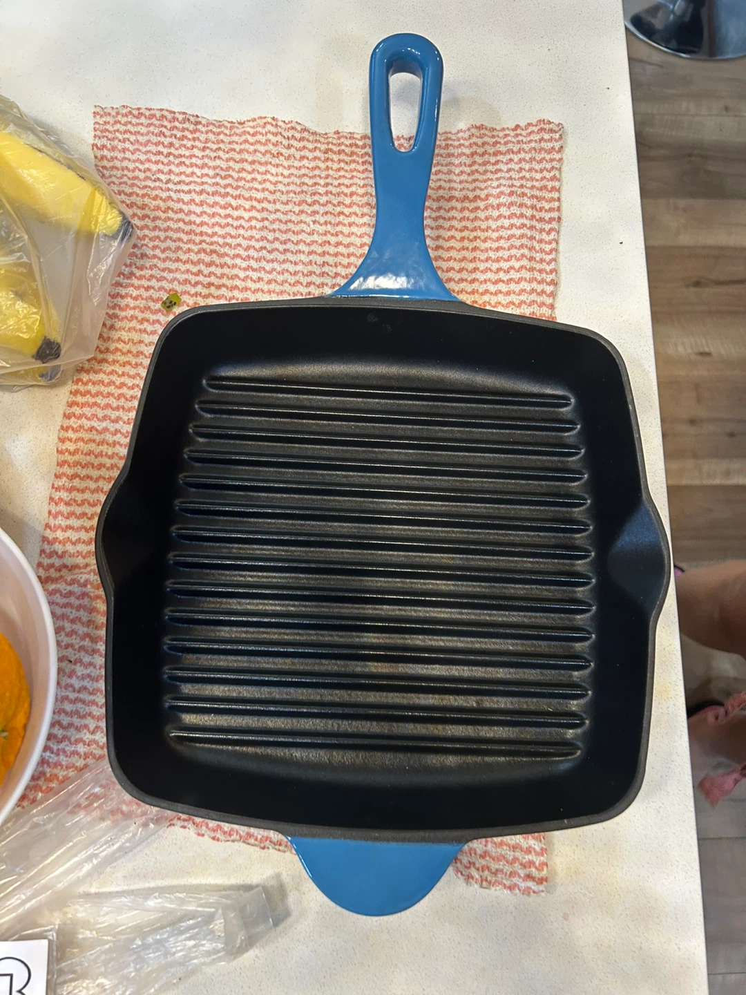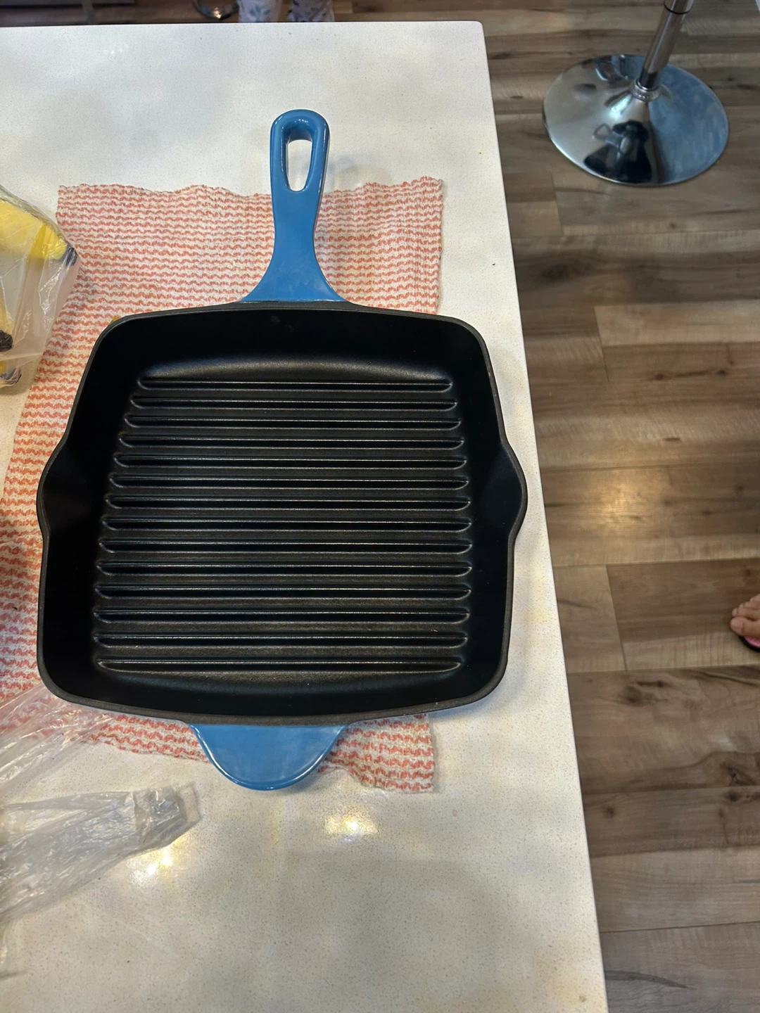 This square cast iron grill pan is perfect for searing meats and vegetables. It features raised ridges to allow fat to drain away. The pan has a comfortable blue handle for easy lifting. Great for stovetop grilling indoors!