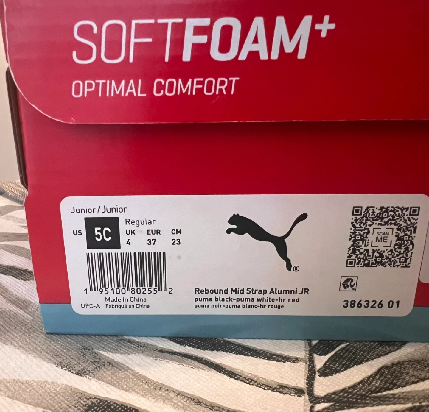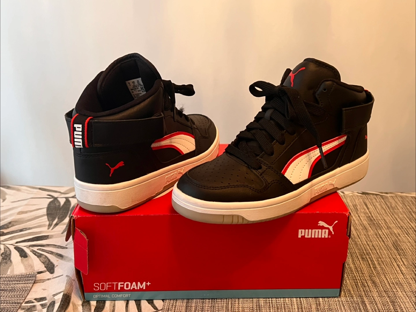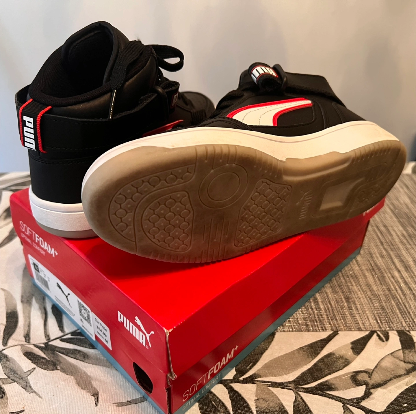 Selling a pair of Puma Rebound Mid Strap Alumni JR sneakers in size 5C. They're black, white, and red and come with the original box. Lightly used.
