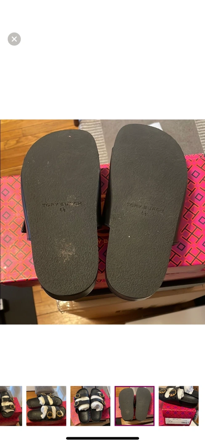 These are a pair of brand new Tory Burch sandals in US size 6.5. They are black leather anatomic slides and come with the original box. Perfect for a stylish and comfortable look!