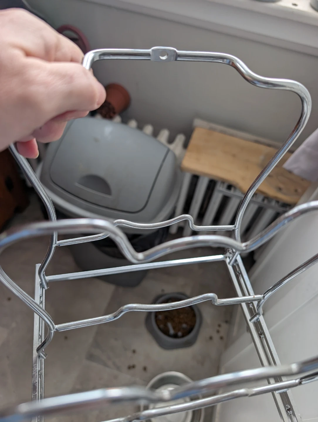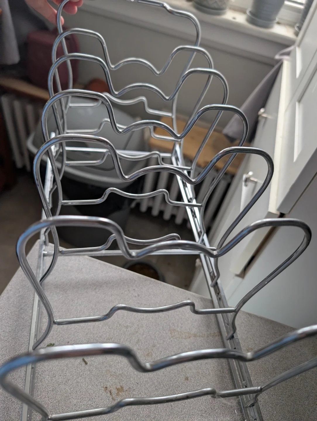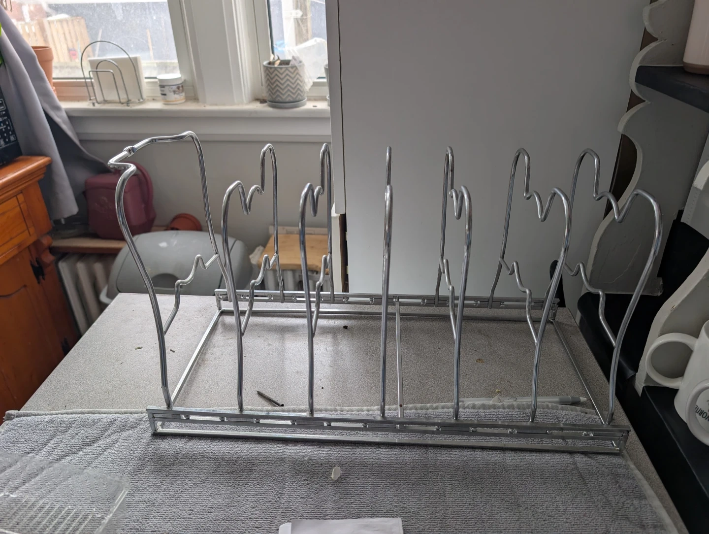 This organizer rack is made of durable silver metal. It features multiple slots designed to hold pot lids upright and easily accessible. Perfect for keeping your kitchen cabinets tidy and maximizing storage space! No delivery.