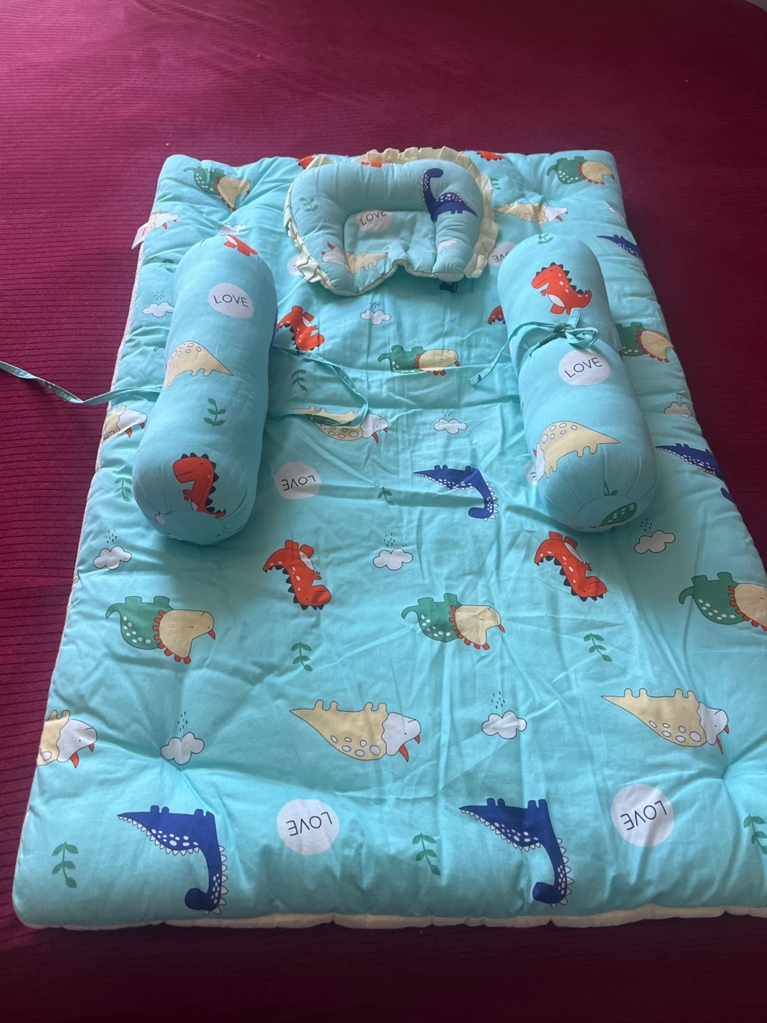 This baby crib set features a cute dinosaur and cloud pattern. It includes a padded mat, a head pillow, and two bolster pillows for comfort. The fabric feels soft.