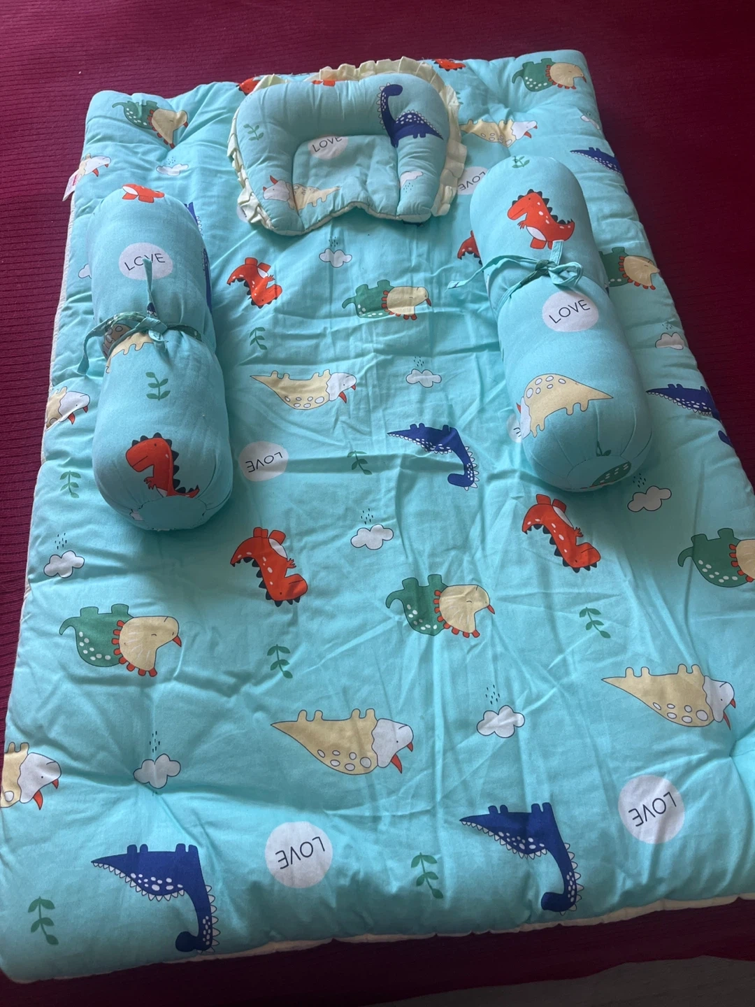 This baby crib set features a cute dinosaur and cloud pattern. It includes a padded mat, a head pillow, and two bolster pillows for comfort. The fabric feels soft.