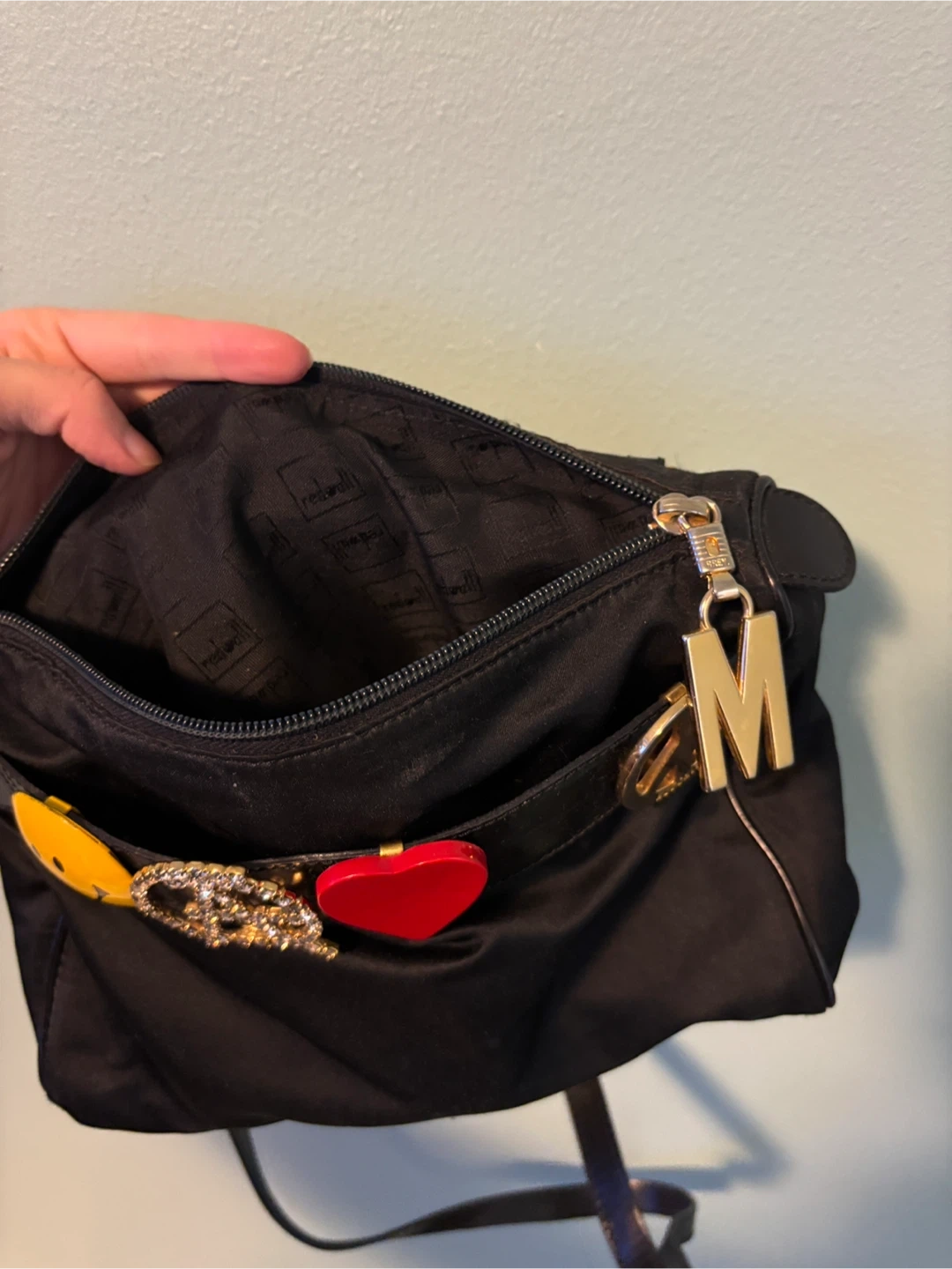A black Moschino crossbody bag made in Italy. It features multiple playful charms, including a smiley face, peace sign, heart, and the letter M. The interior lining is patterned.