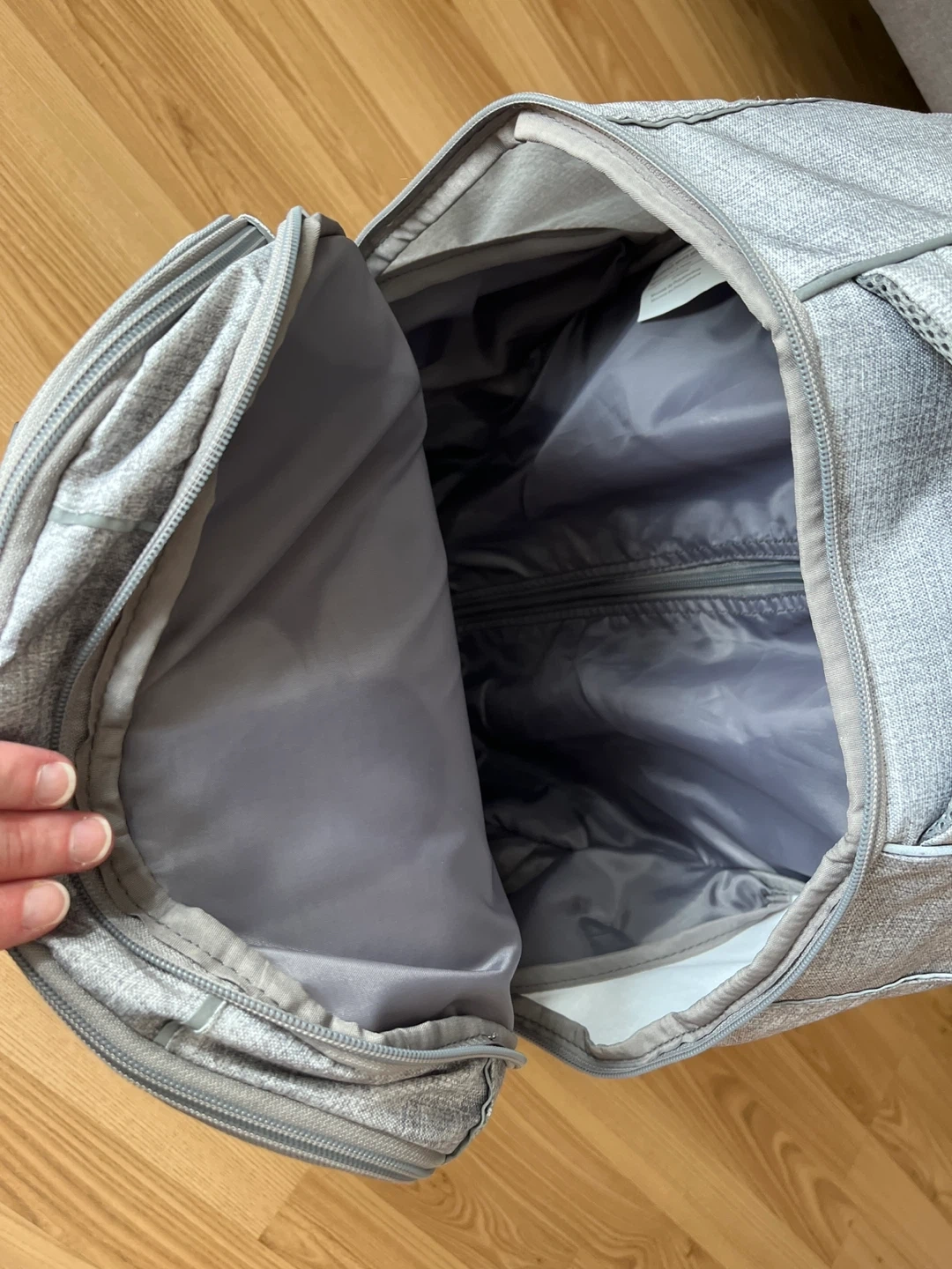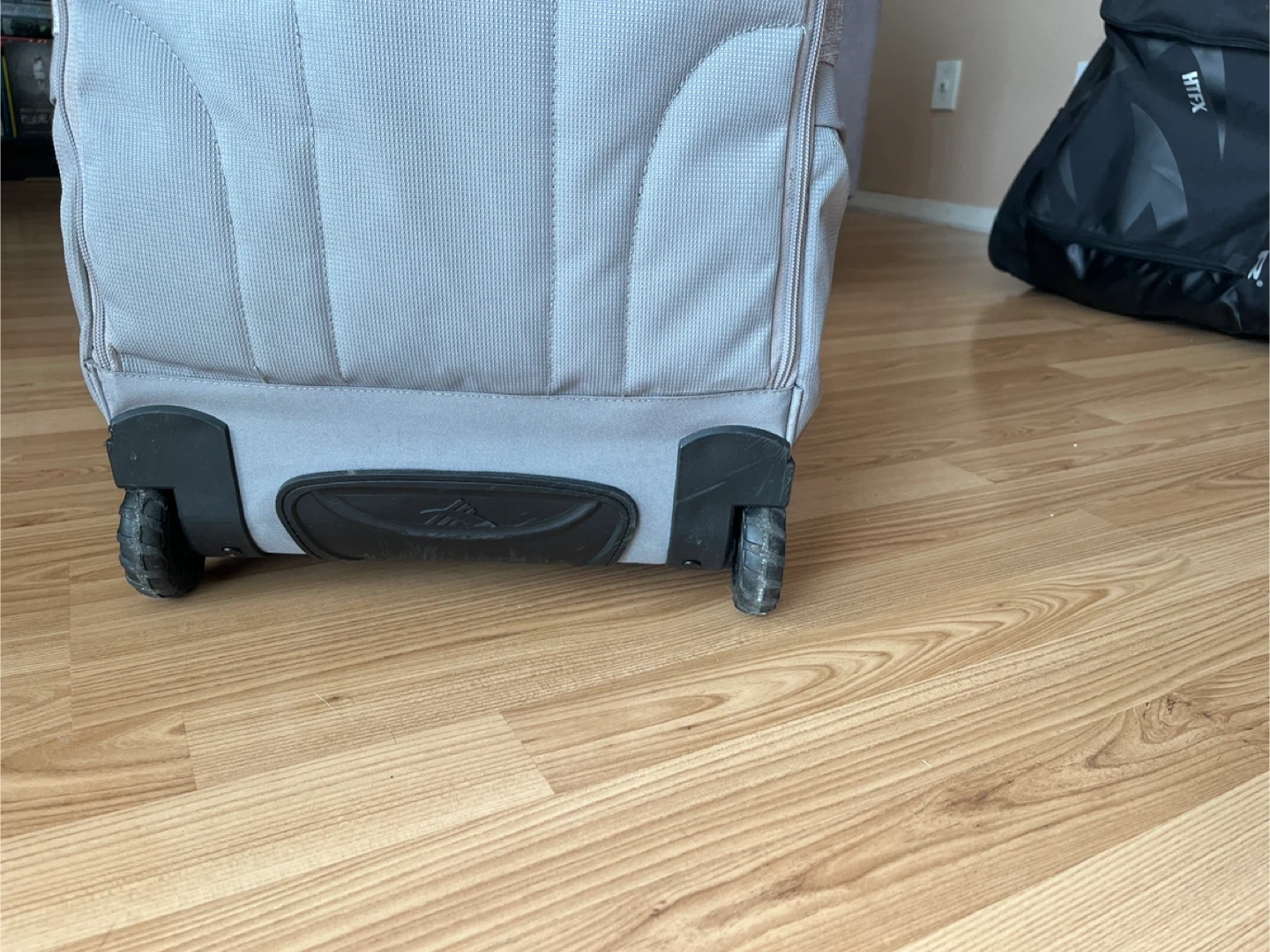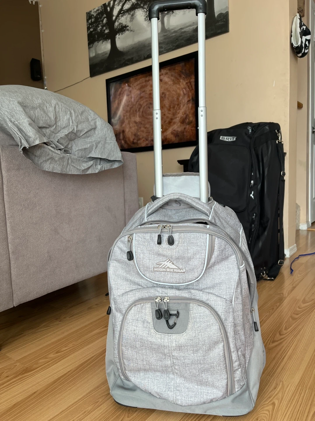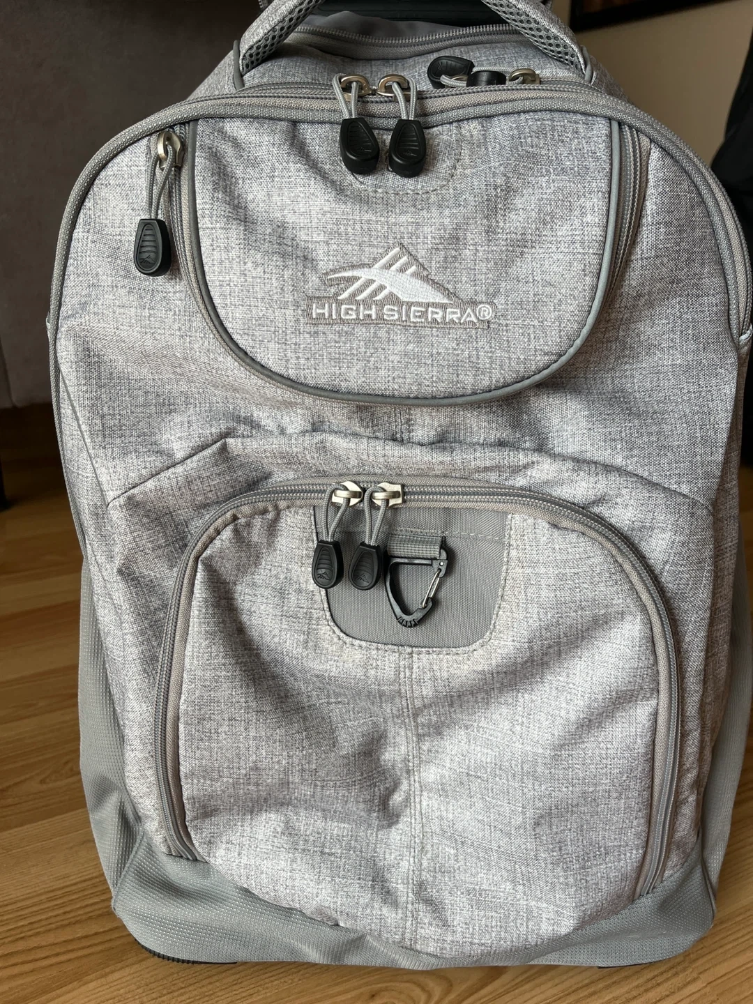 This High Sierra backpack features wheels and a retractable handle for easy transport. It's a light grey heathered fabric with multiple zippered compartments. Perfect for travel or school! Gently used