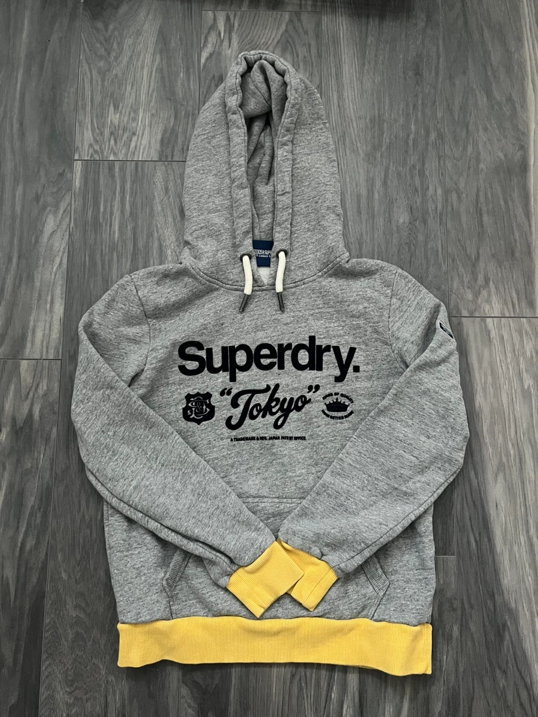 Superdry “Tokyo” grey and yellow lined hoodie. Vintage hoodie. Thick material. Cotton blend makes the hoodie soft and comfortable. Features front pocket and drawstrings on hood.