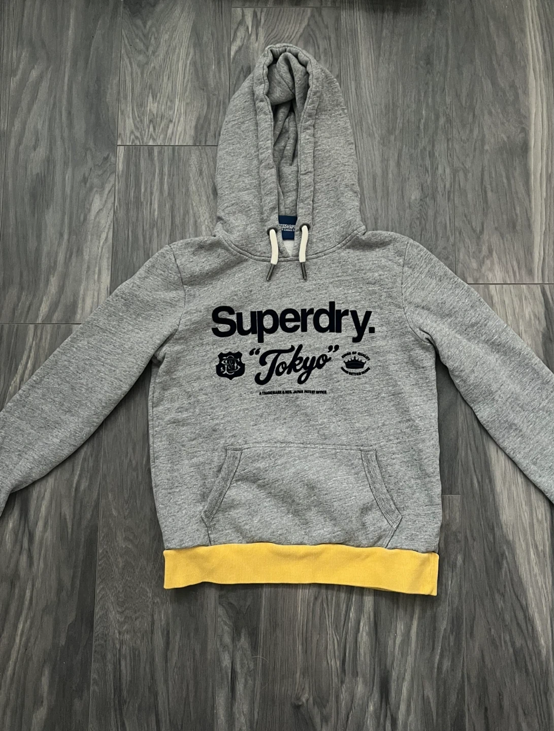 Superdry “Tokyo” grey and yellow lined hoodie. Vintage hoodie. Thick material. Cotton blend makes the hoodie soft and comfortable. Features front pocket and drawstrings on hood.