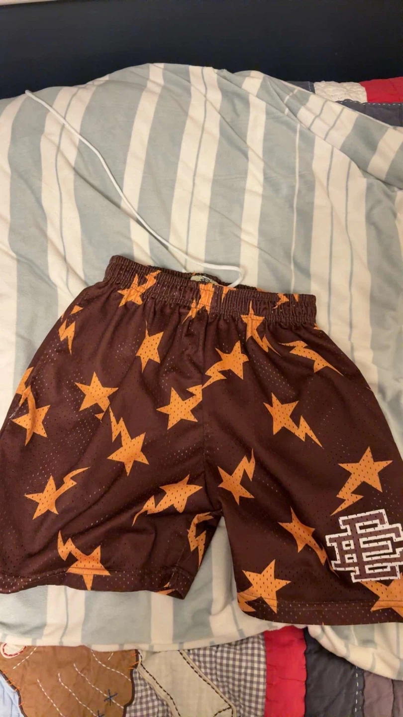 BAPE brown shorts with all-over star pattern, clean condition and comfortable fit. High-quality material with a standout design, perfect for streetwear outfits.