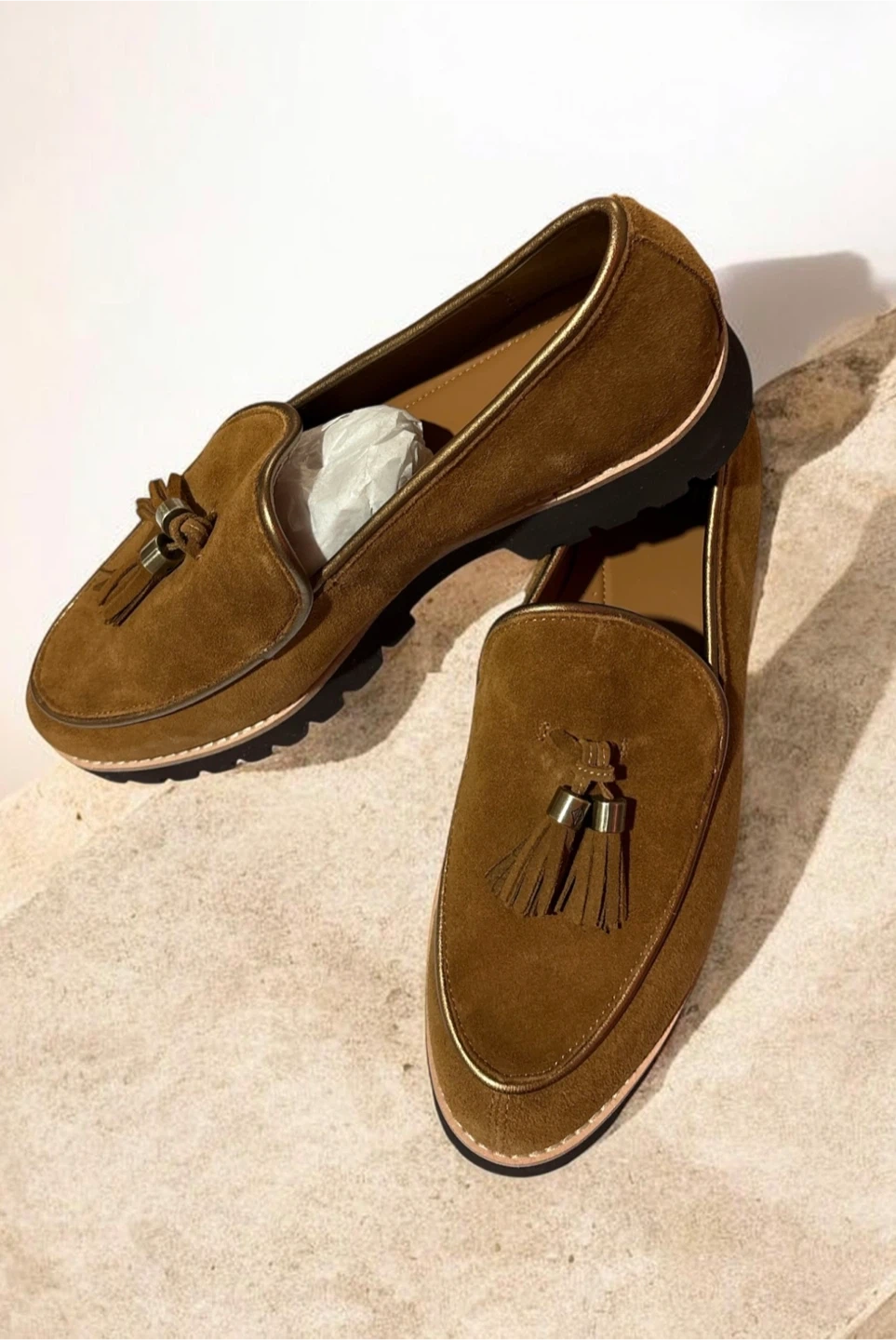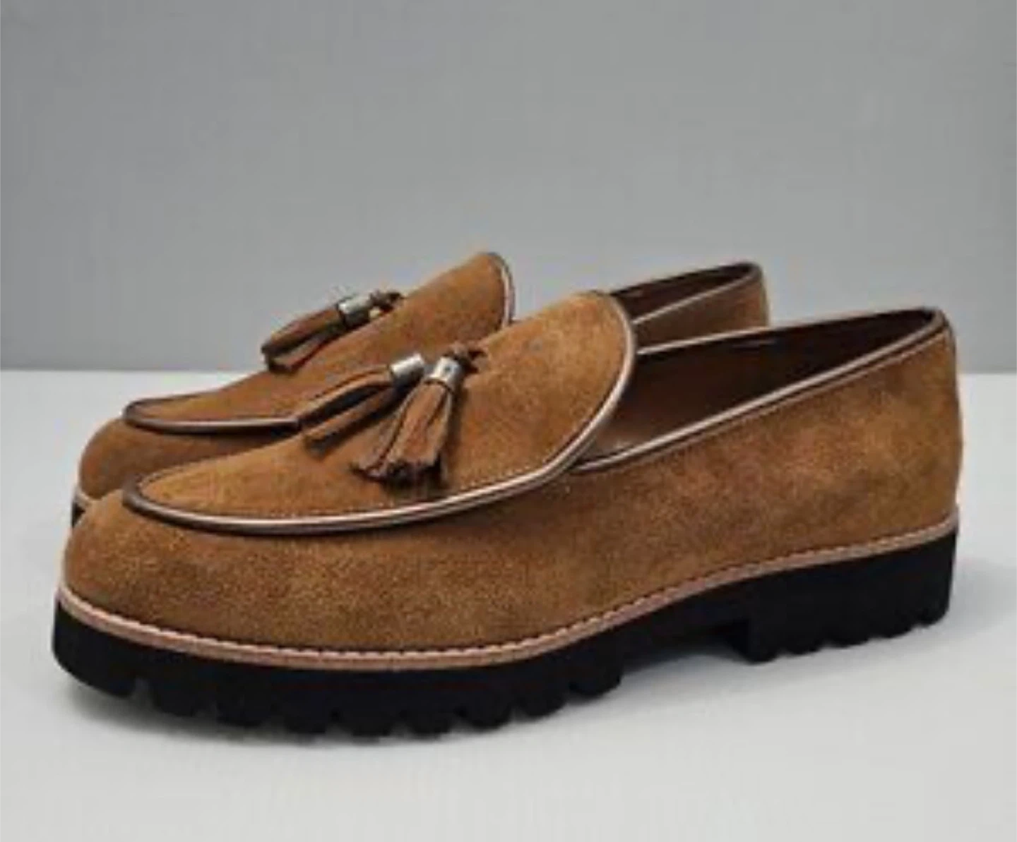 These Donald Pliner loafers are crafted from soft brown suede. They feature stylish tassels and a durable lug sole. Made in China. Size 11M.