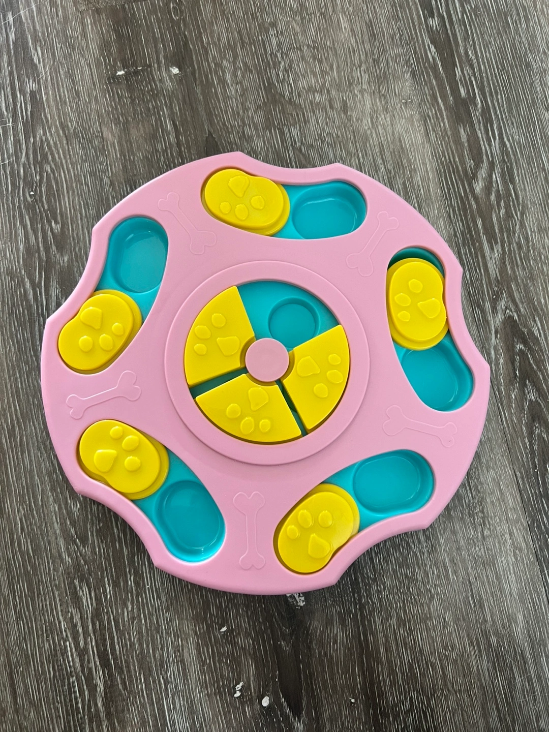 Bright pink and yellow dog puzzle toy. Features several compartments and sliding pieces. A perfect gift to give your furry friend some mental stimulation.