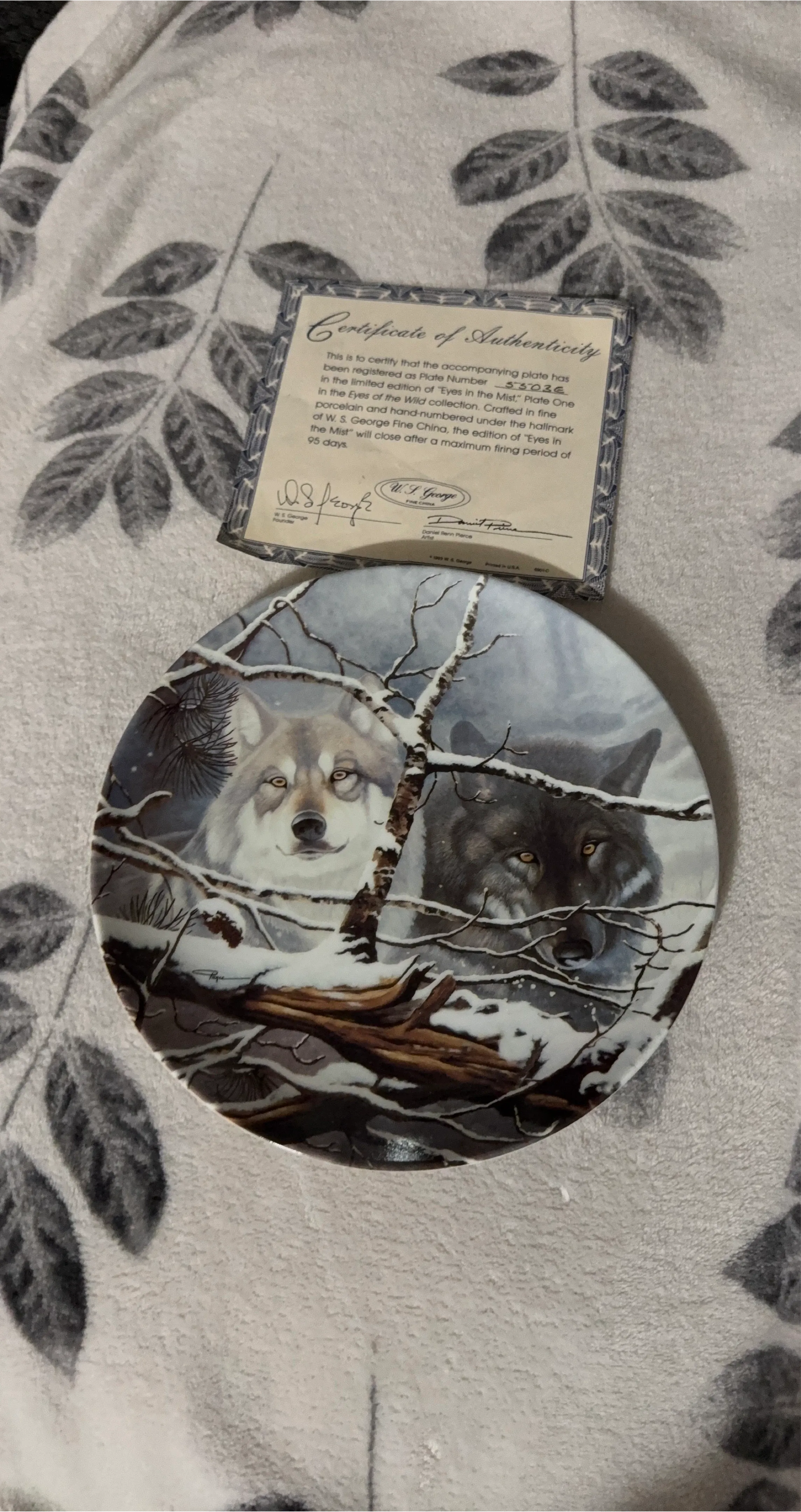 This is Plate One from the "Eyes in the Wild" collection by W. S. George Fine China. It's crafted in fine porcelain and features a wolf design. The edition is limited and hand-numbered.