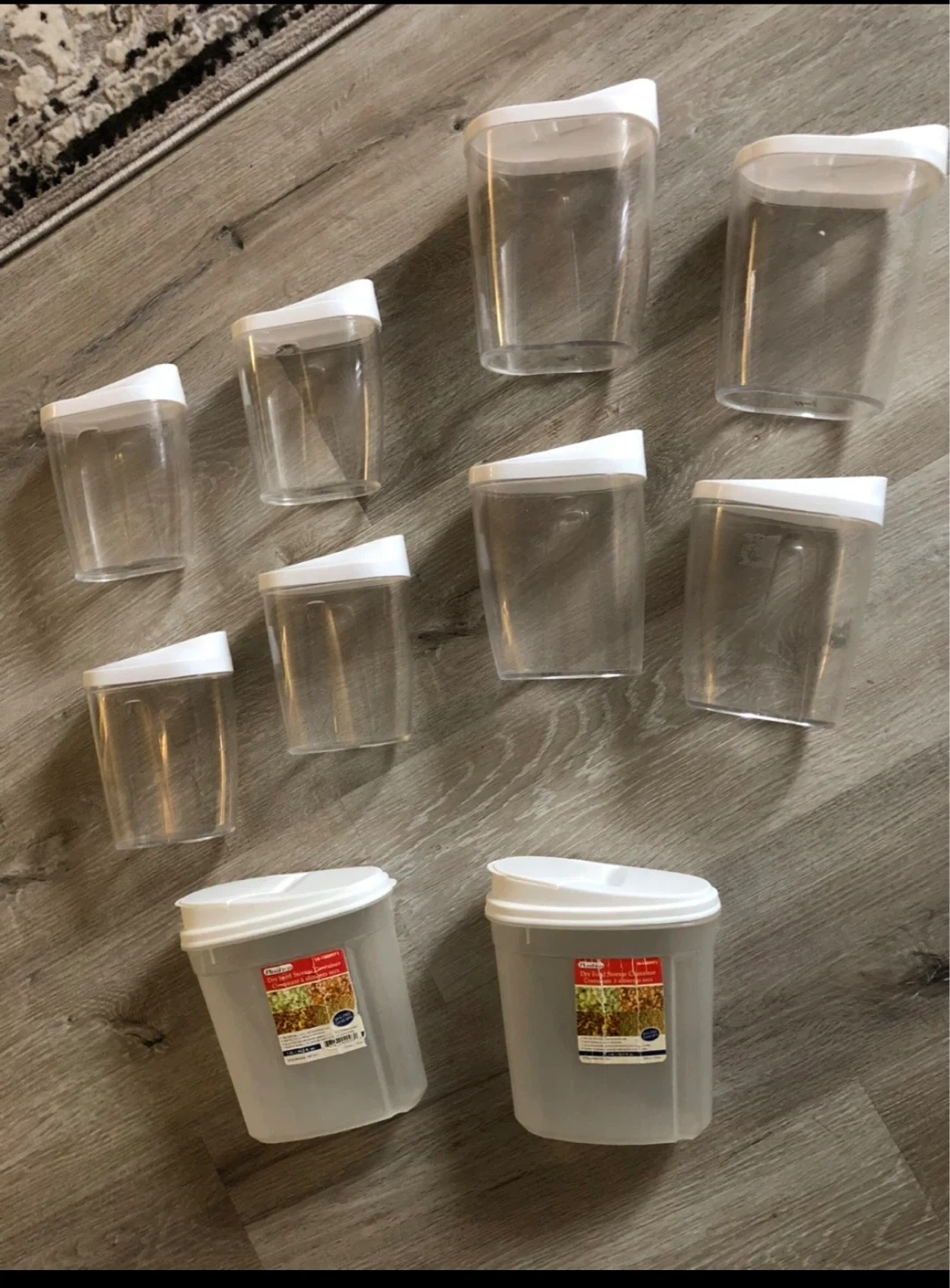 This set includes total of 10 dry food storage containers. They're made of clear plastic with white lids, perfect for pantry organization.