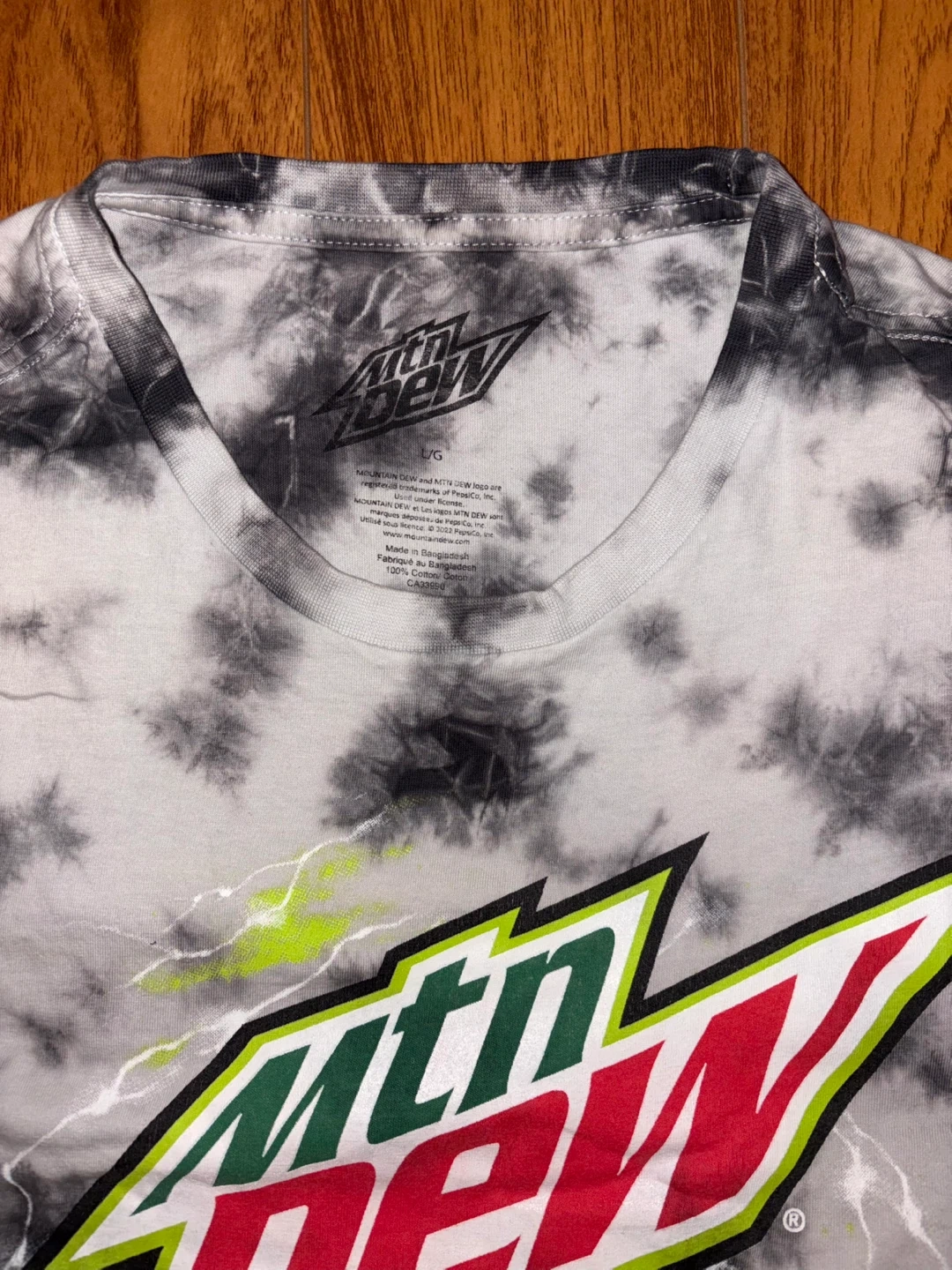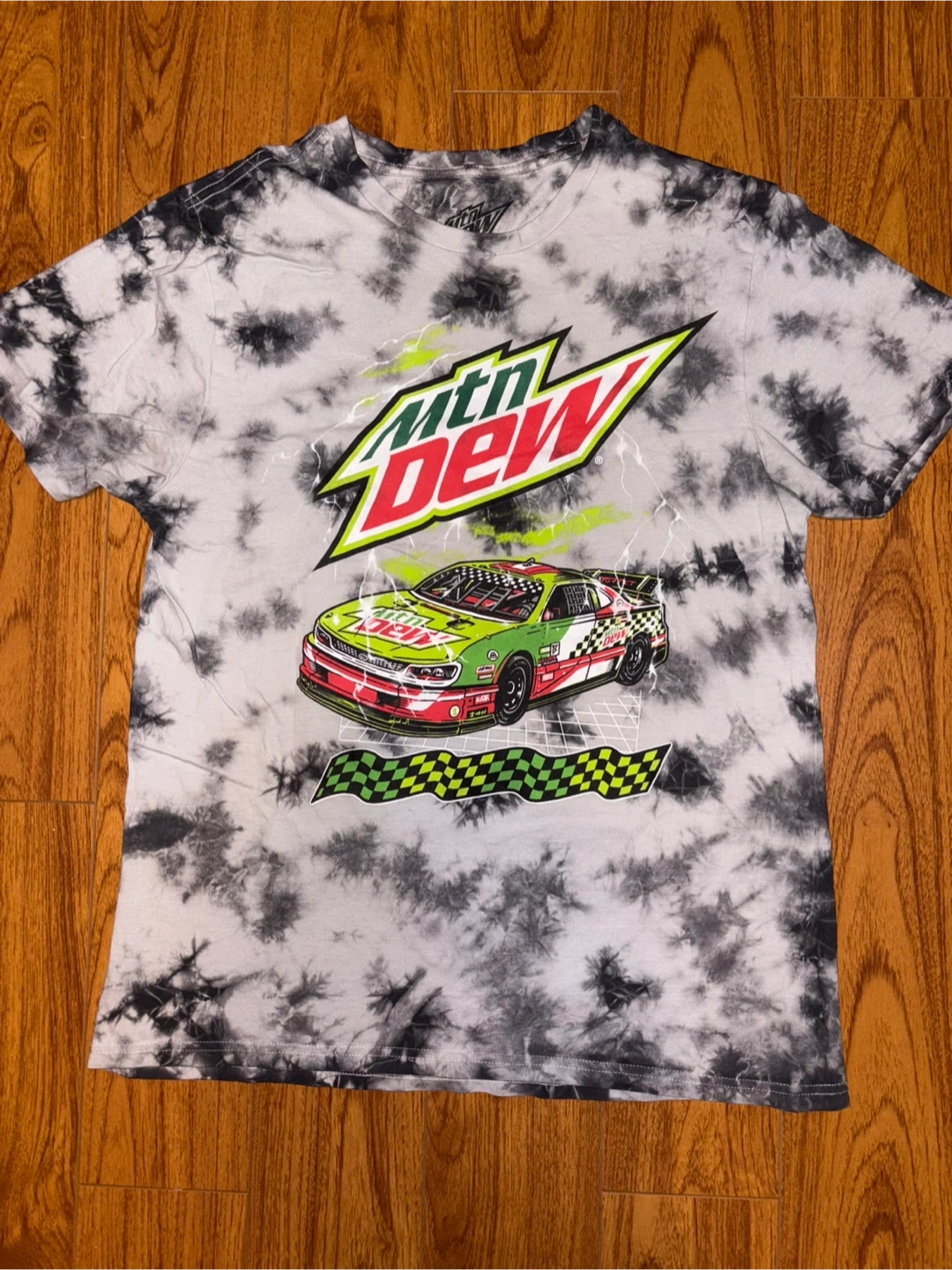 This Mtn Dew graphic tee features a cool tie-dye pattern. It's a size large with a vibrant racing car print. 100% cotton for comfort!