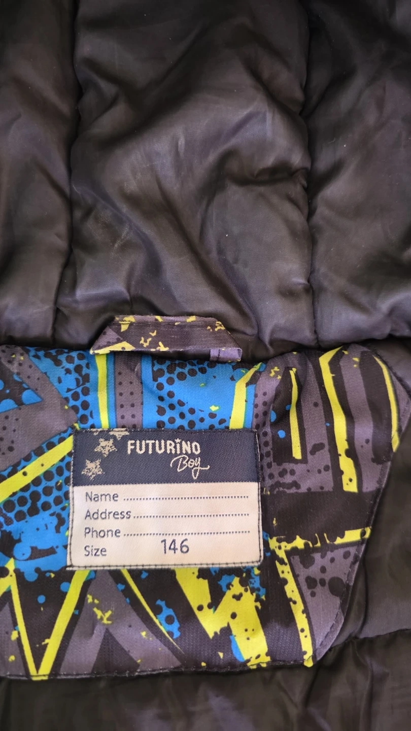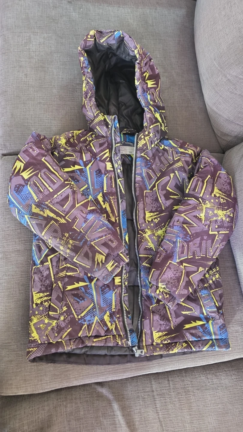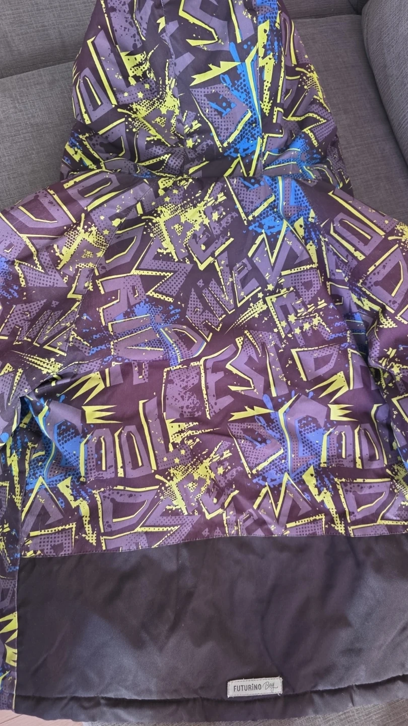 FUTURINO Boy winter jacket with a fun graffiti-style print. It's a, perfect fit for an 8/9 y/o boy, great for keeping warm during the colder months! This jacket features a hood and a zip-up front. Only available for pick-up.
