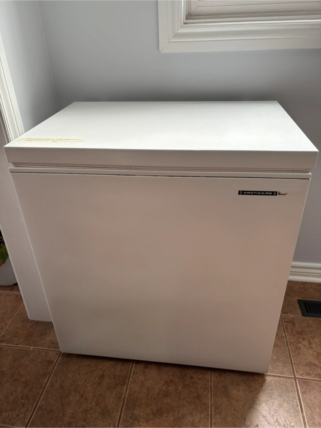 Selling an ArcticAire chest freezer in white. It's in used condition and shows some signs of wear. NEED GONE ASAP