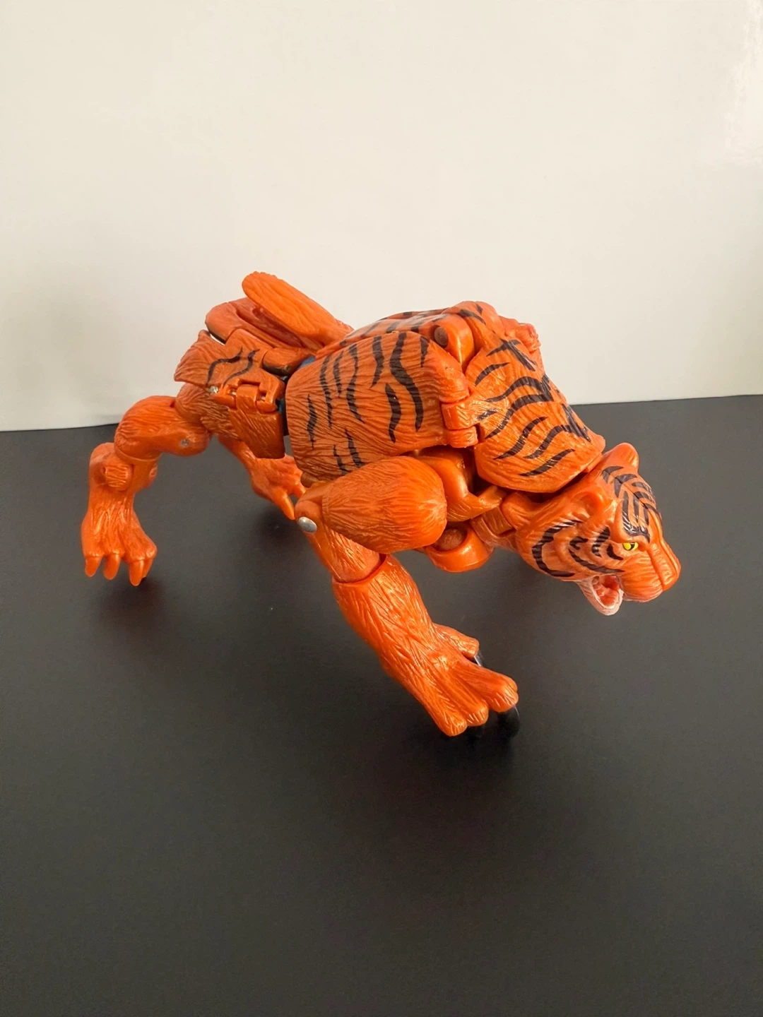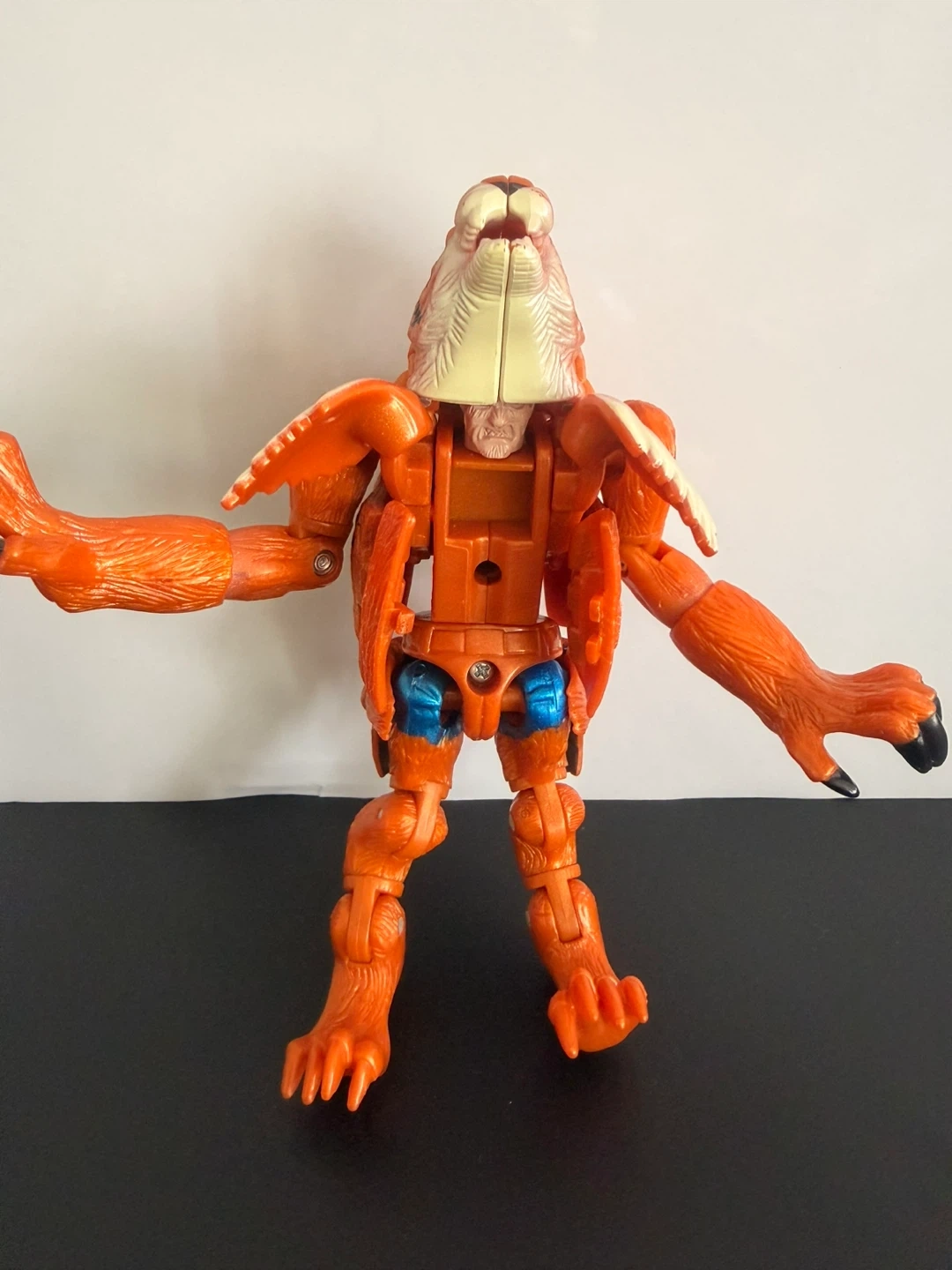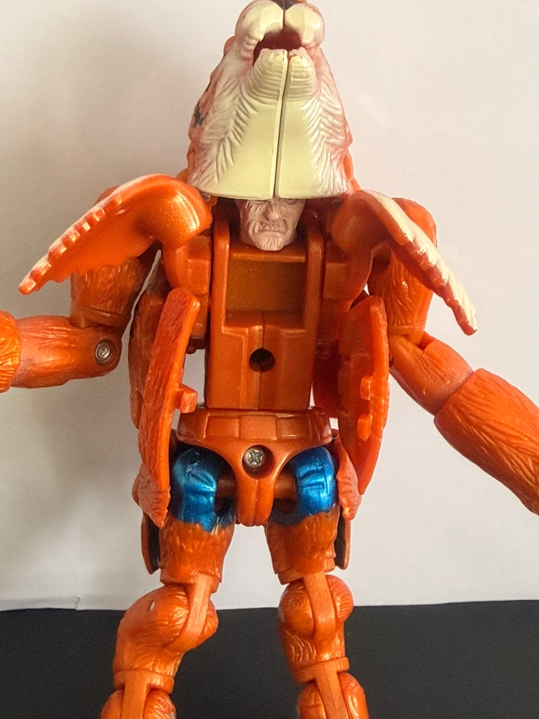 This is a Beast Wars Transmetal Optimus Primal action figure. It's an orange tiger robot that transforms into an ape-like creature. Includes the original gray head piece that flips down.