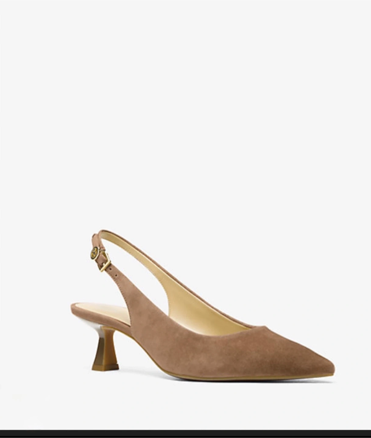 Chic Michael Kors slingback heels made from soft brown suede. They feature a pointed toe and a stylish flared heel with a buckle accent. These shoes are a versatile addition for any wardrobe!