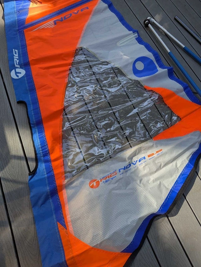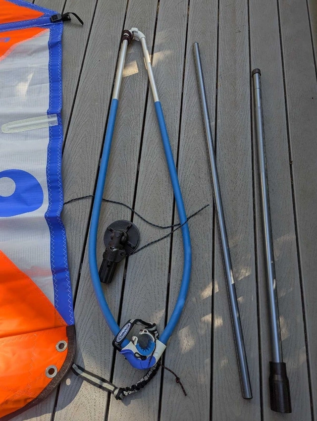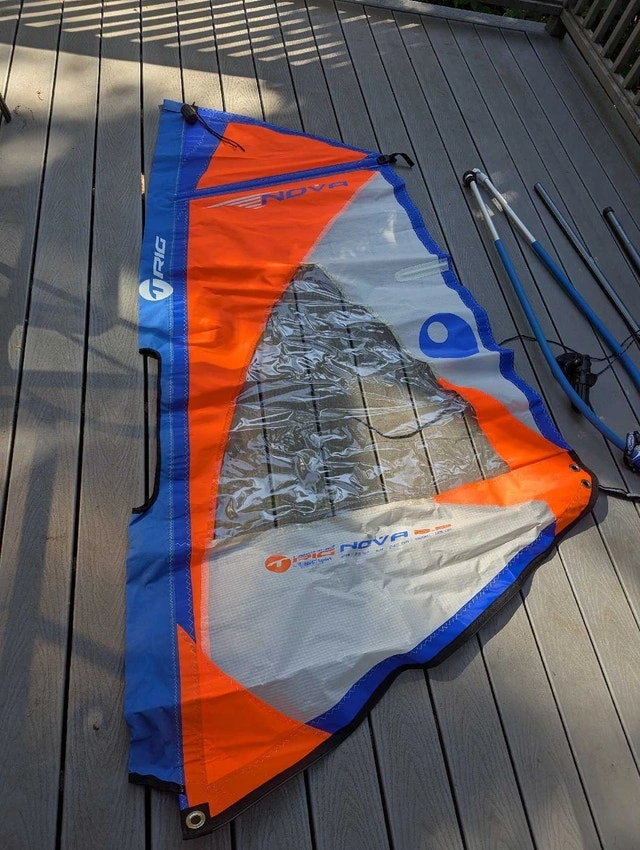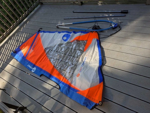 New, unused Bic Techno 2.5m kids windsurfing sail rig. Sail is a little wrinkled, but undamaged from storage. Includes lightweight 2 piece mast, clamp on boom, Europin base and stubby extension. Perfect setup to get your little ones started in this amazing sport. Includes handy carrying case, which is dusty.