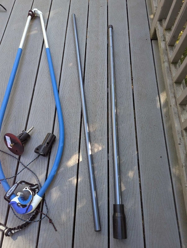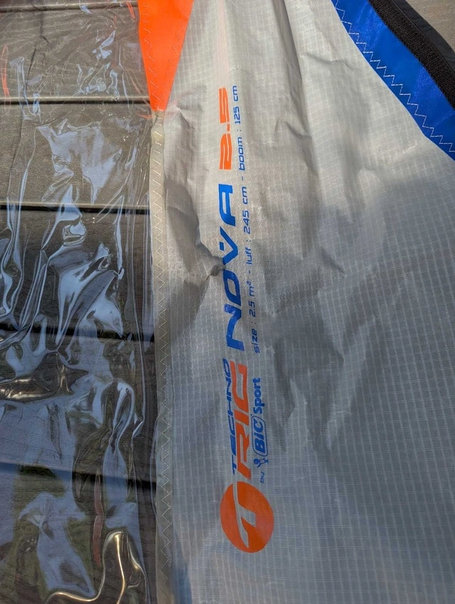 New, unused Bic Techno 2.5m kids windsurfing sail rig. Sail is a little wrinkled, but undamaged from storage. Includes lightweight 2 piece mast, clamp on boom, Europin base and stubby extension. Perfect setup to get your little ones started in this amazing sport. Includes handy carrying case, which is dusty.