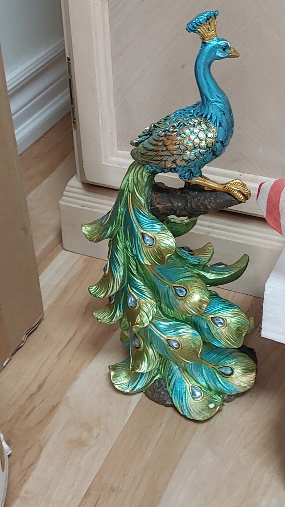 Beautiful peacock figurine. Detailed design. Green and blue colours. Perched on a branch. Great for home decor.