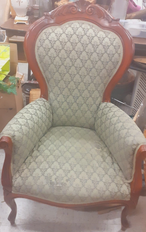 An old armchair. Features a detailed wooden frame. Upholstered in a patterned fabric. A perfect spot to sit with your favourite book and a cup of tea for a relaxing afternoon.