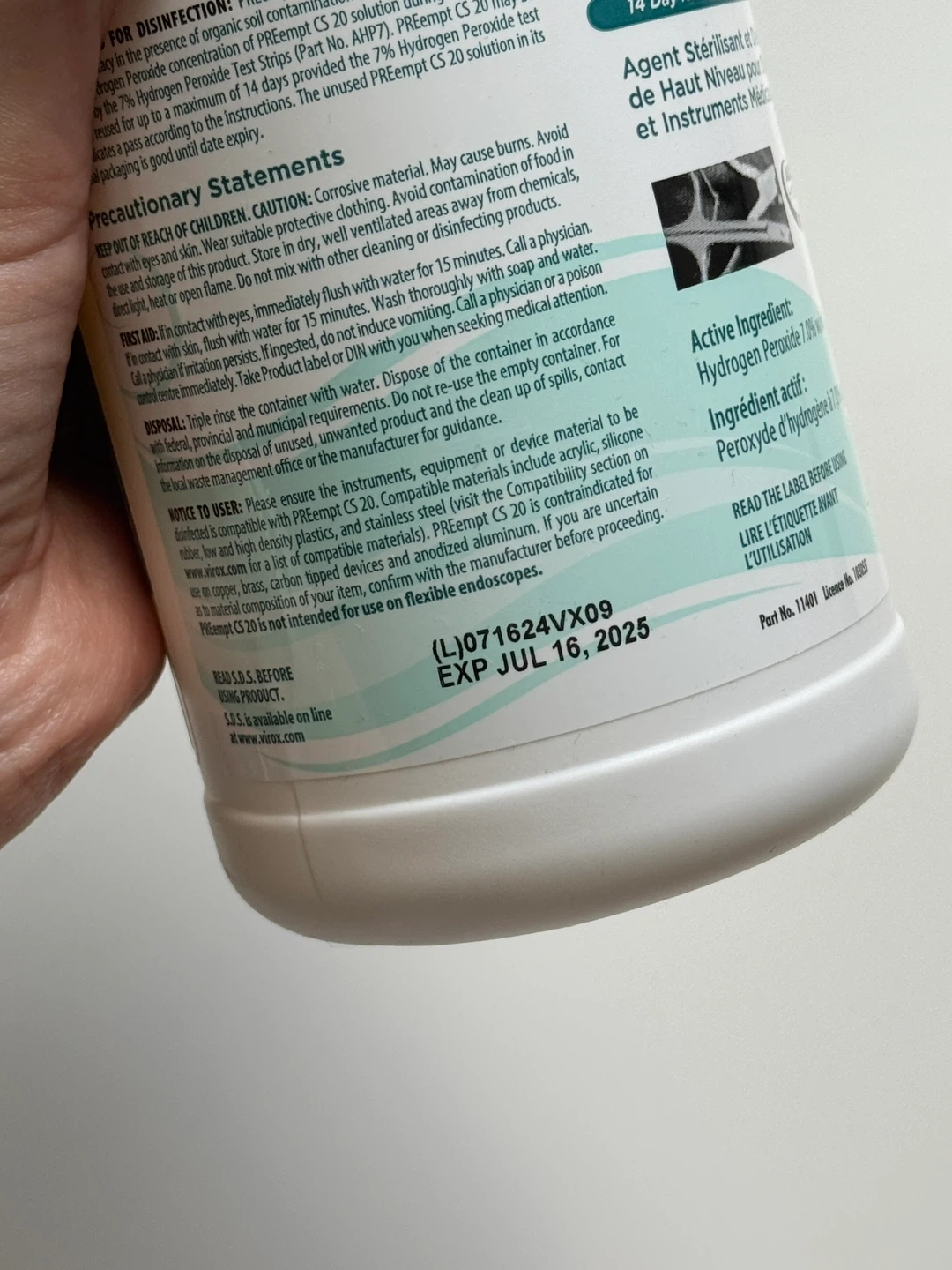 Preempt CS20 sterilant and high-level disinfectant for medical devices and instruments. Active ingredient: Hydrogen Peroxide 7.0% w/w. Solution is stable and reusable for up to 14 days. Expiry Jul 16, 2025.