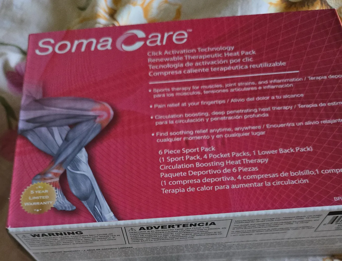 The packaging shows a heat pack to ease muscle pain. Offers a 6-piece sport pack. Use this product for your own comfort at any time.