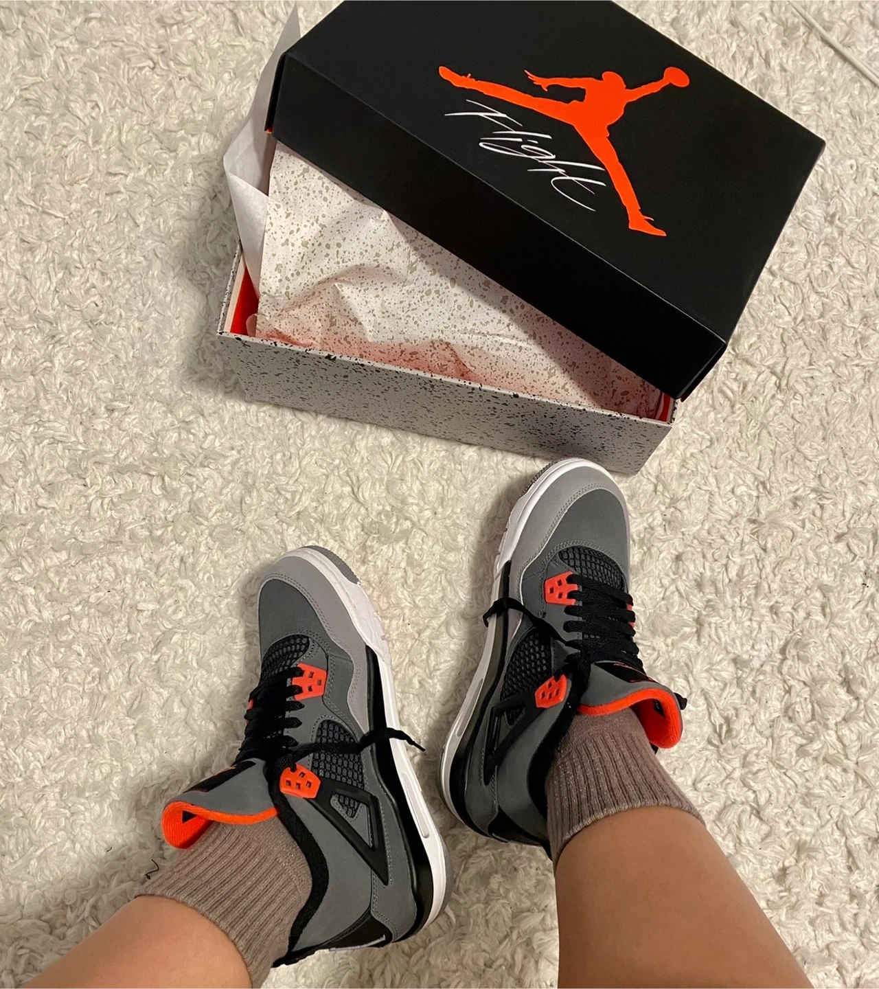 Selling a pair of Air Jordan 4 Retro sneakers in a stylish grey and orange colourway! They come with the original box, perfect for any sneakerhead or Jordan fan size 7-7.5W