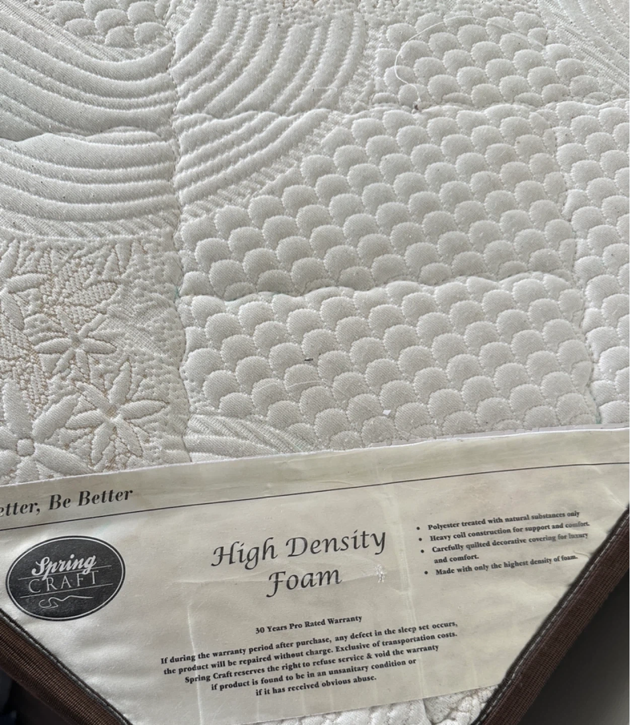 This is a Spring Craft high-density foam double mattress. It’s in okay condition. Alongside the double bed frame which is in likely new condition.