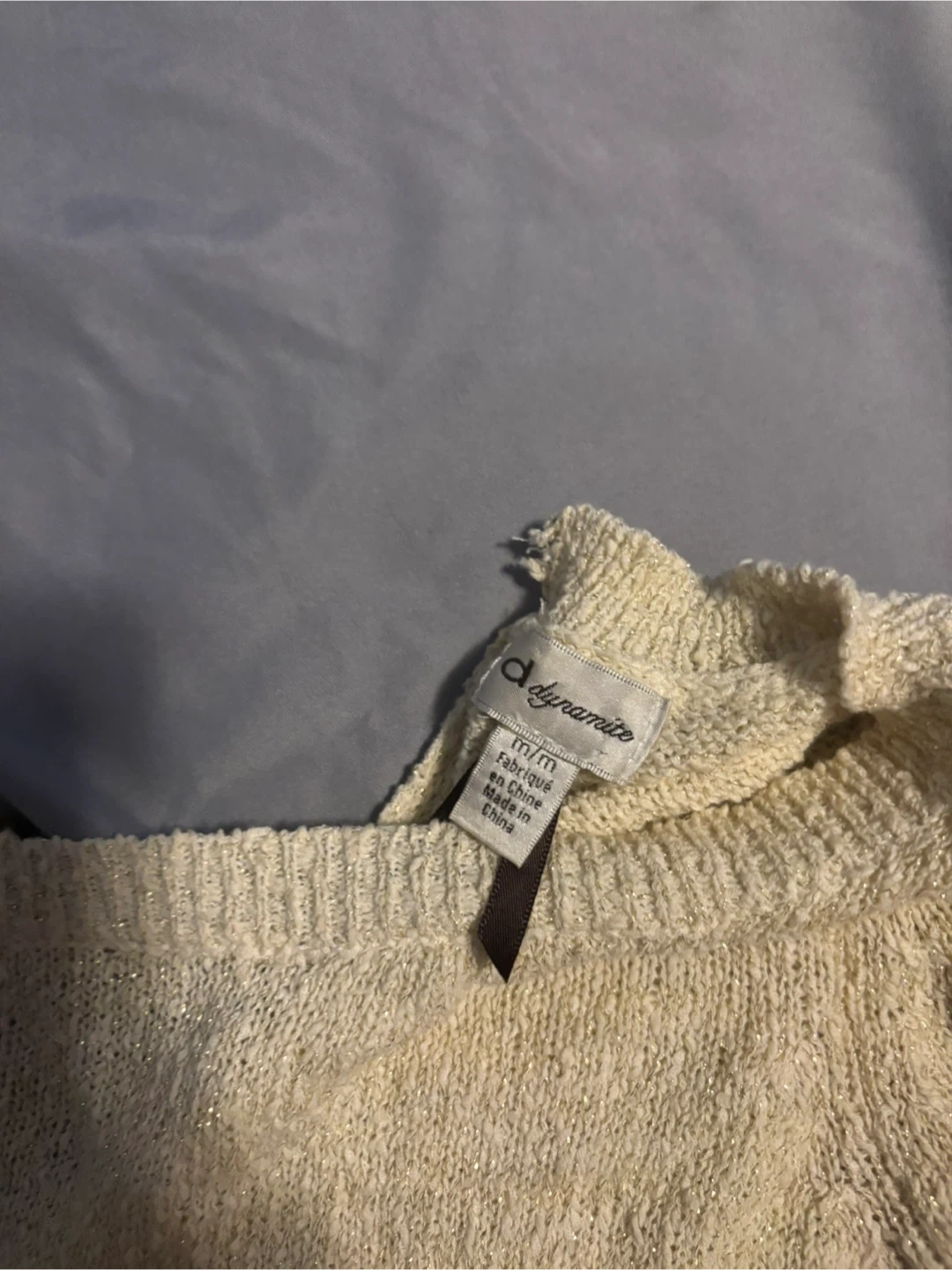 This is a cream knit sweater from Dynamite. It's a size medium with a sparkly thread woven into the material. The sweater is lightweight and has a relaxed fit.
