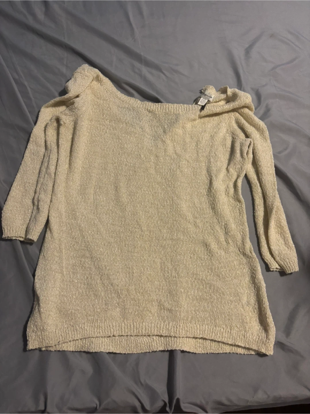 This is a cream knit sweater from Dynamite. It's a size medium with a sparkly thread woven into the material. The sweater is lightweight and has a relaxed fit.