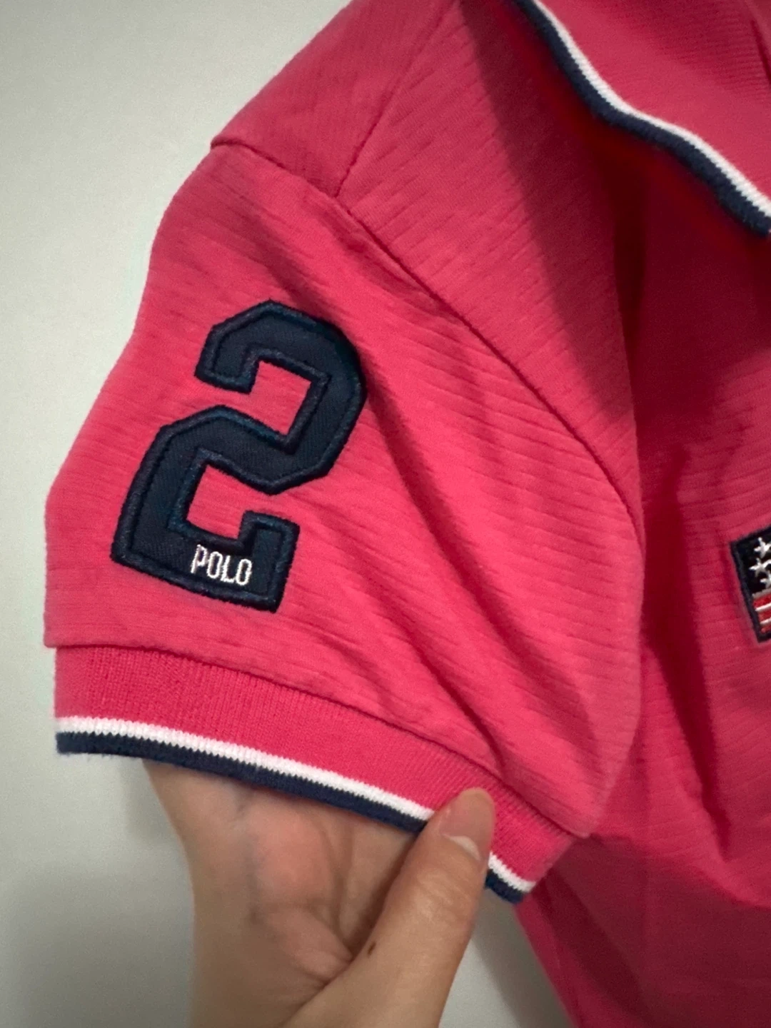 Selling a cute Polo Jeans Company polo shirt! It's a vibrant pink colour and size small. Features a USA flag patch and the number 2 on the sleeve. Perfect for a casual, preppy look!