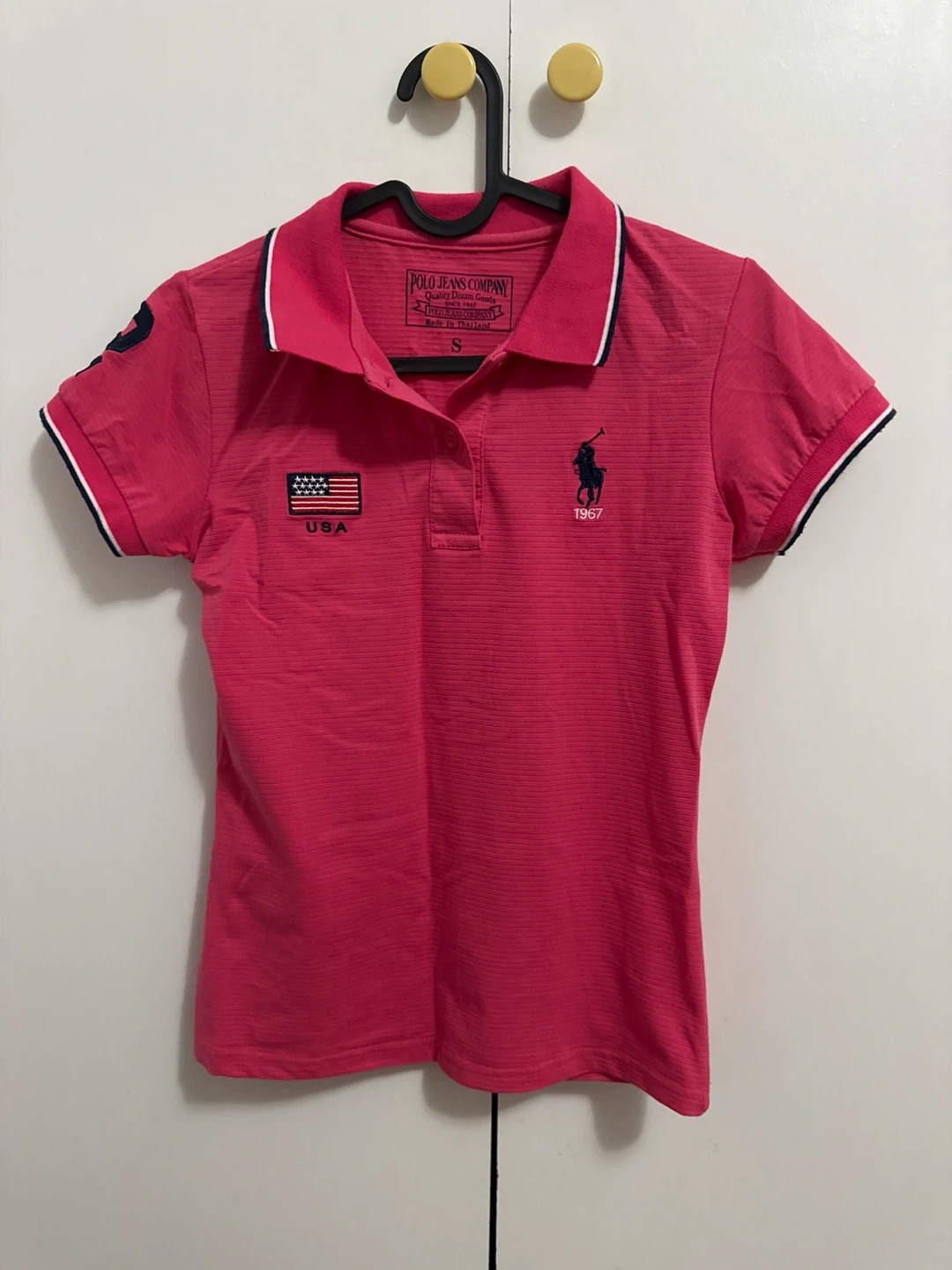 Selling a cute Polo Jeans Company polo shirt! It's a vibrant pink colour and size small. Features a USA flag patch and the number 2 on the sleeve. Perfect for a casual, preppy look!