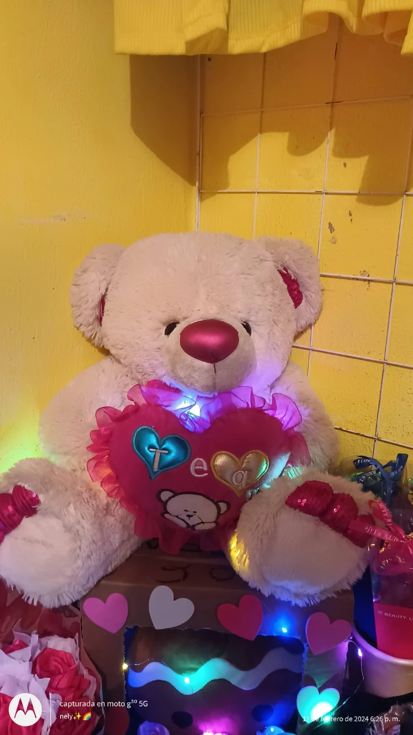 A large, fluffy white teddy bear holding a pink heart pillow that lights up. It's a sweet gift for someone special. The pillow has colorful accents and decorative trim.