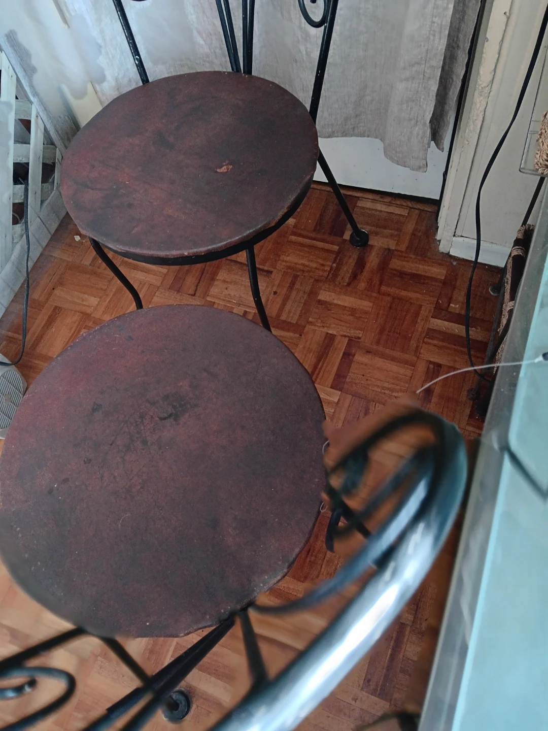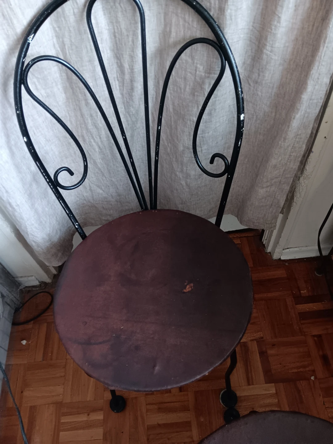 Two bistro-style chairs with black metal frames and ornate backs. The seats are round and made of wood/covered with leather. These chairs would be lovely for a small kitchen nook or balcony. Needs a bit of touch up black paint.