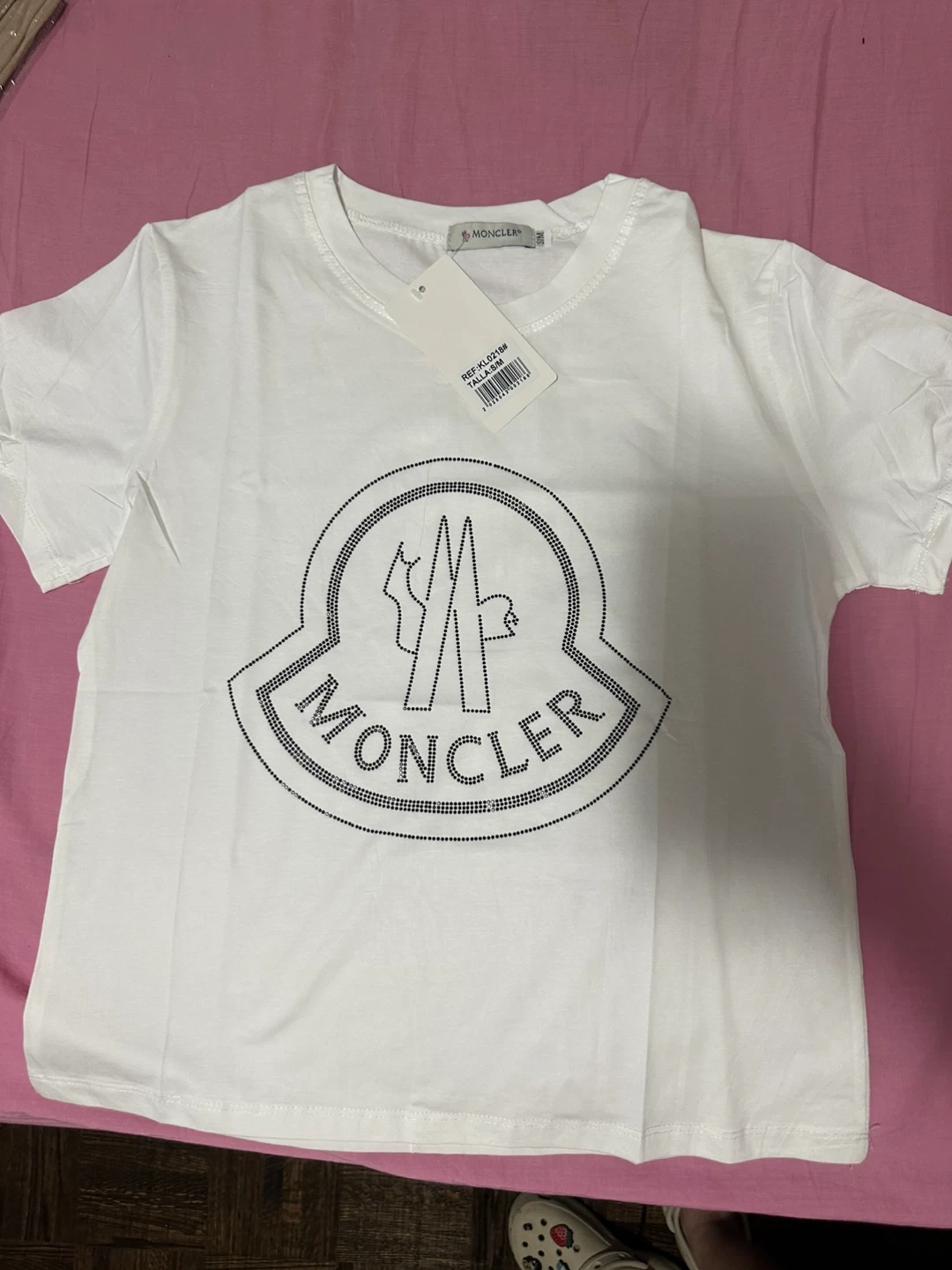 Two brand new Moncler t-shirts, one black and one tan. Both feature the iconic Moncler logo embellished with rhinestones. Original tags attached. These shirts offer a stylish and comfortable fit.