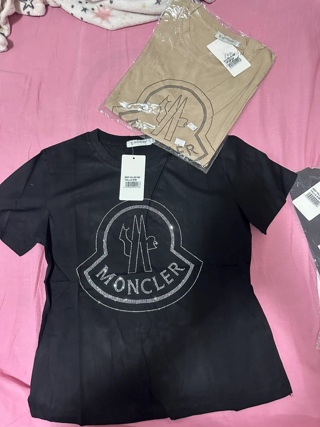 Two brand new Moncler t-shirts, one black and one tan. Both feature the iconic Moncler logo embellished with rhinestones. Original tags attached. These shirts offer a stylish and comfortable fit.